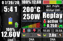 -- In den Mainscreens sind Coil-Temp, Coil-Power, Vorheiz-Temp, Vorheiz-Power, Widerstand, Ohm-Lock, Replay und Replay-Wärme einstellbar --