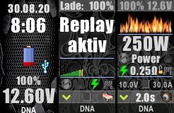 Zusätzlich werden die Worte "Replay" und "aktiviert" in großen gelben Zeichen auf beiden Mainscreens des Themes angezeigt.