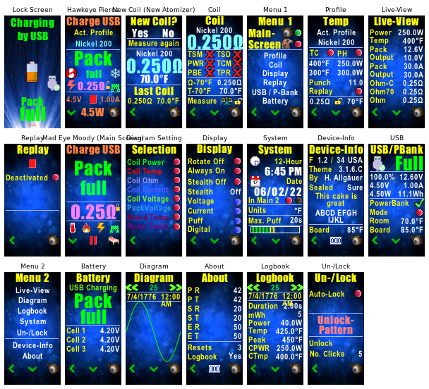 -- In den Mainscreens sind Coil-Temp, Coil-Power, Vorheiz-Temp, Vorheiz-Power, Widerstand, Ohm-Lock, Replay und Replay-Wärme einstellbar --