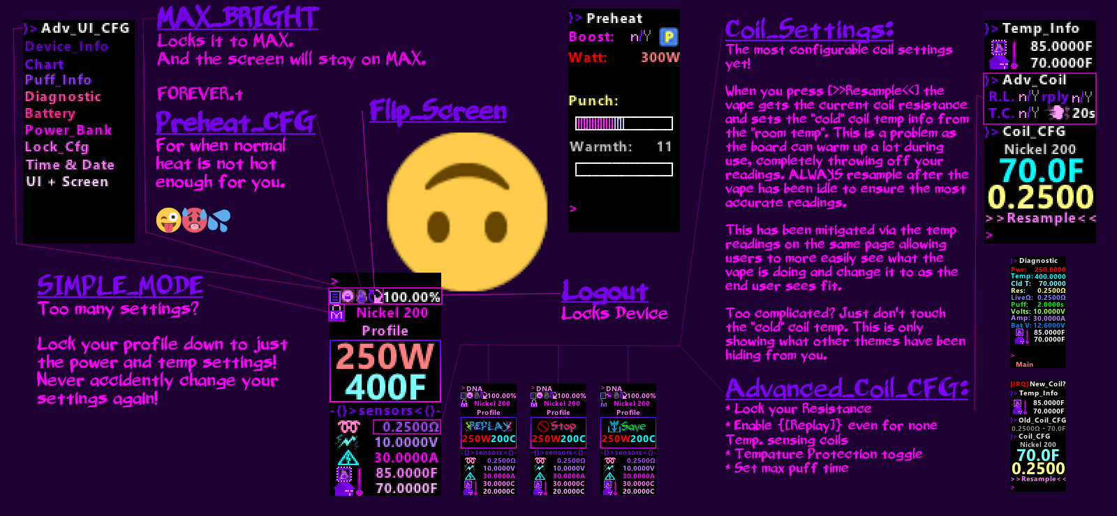 I'm a massive h*cking nerd if you couldn't already tell. This theme is themed after a computer terminal as that is where I spent most of my days. I love the minimalist high contrast look and wanted to bring that l33t l00k to not only to just my vape but YOUR vape!