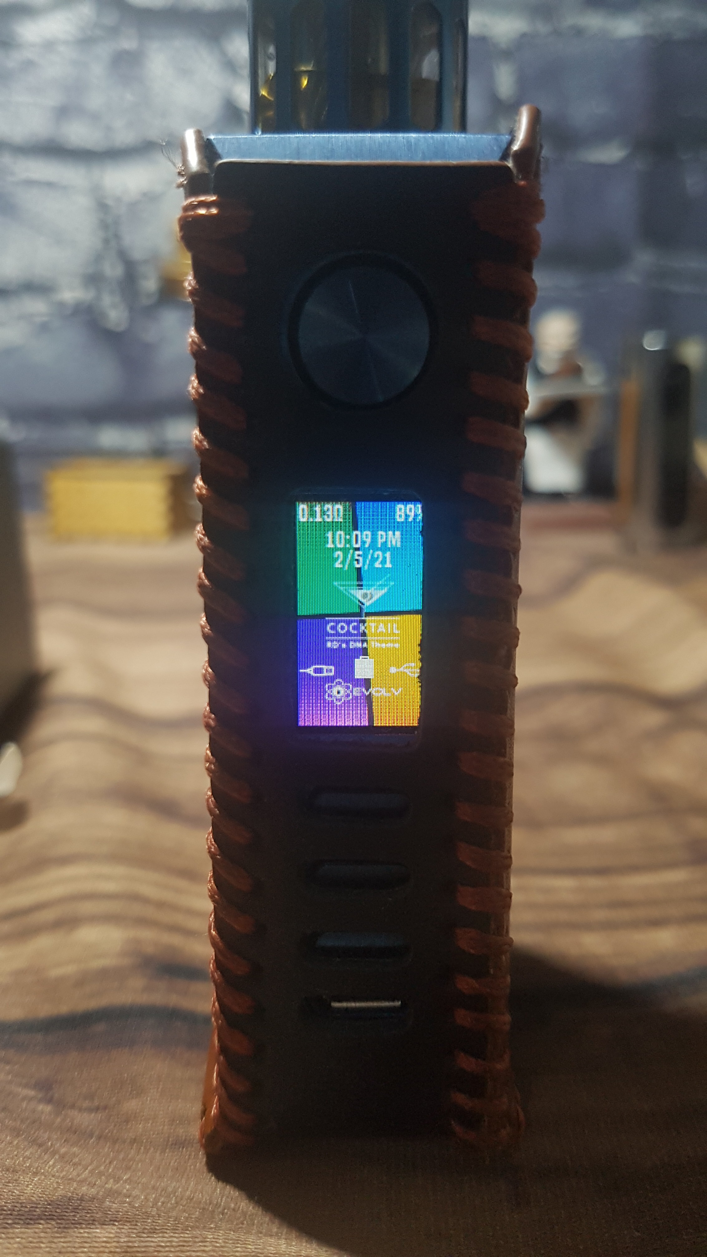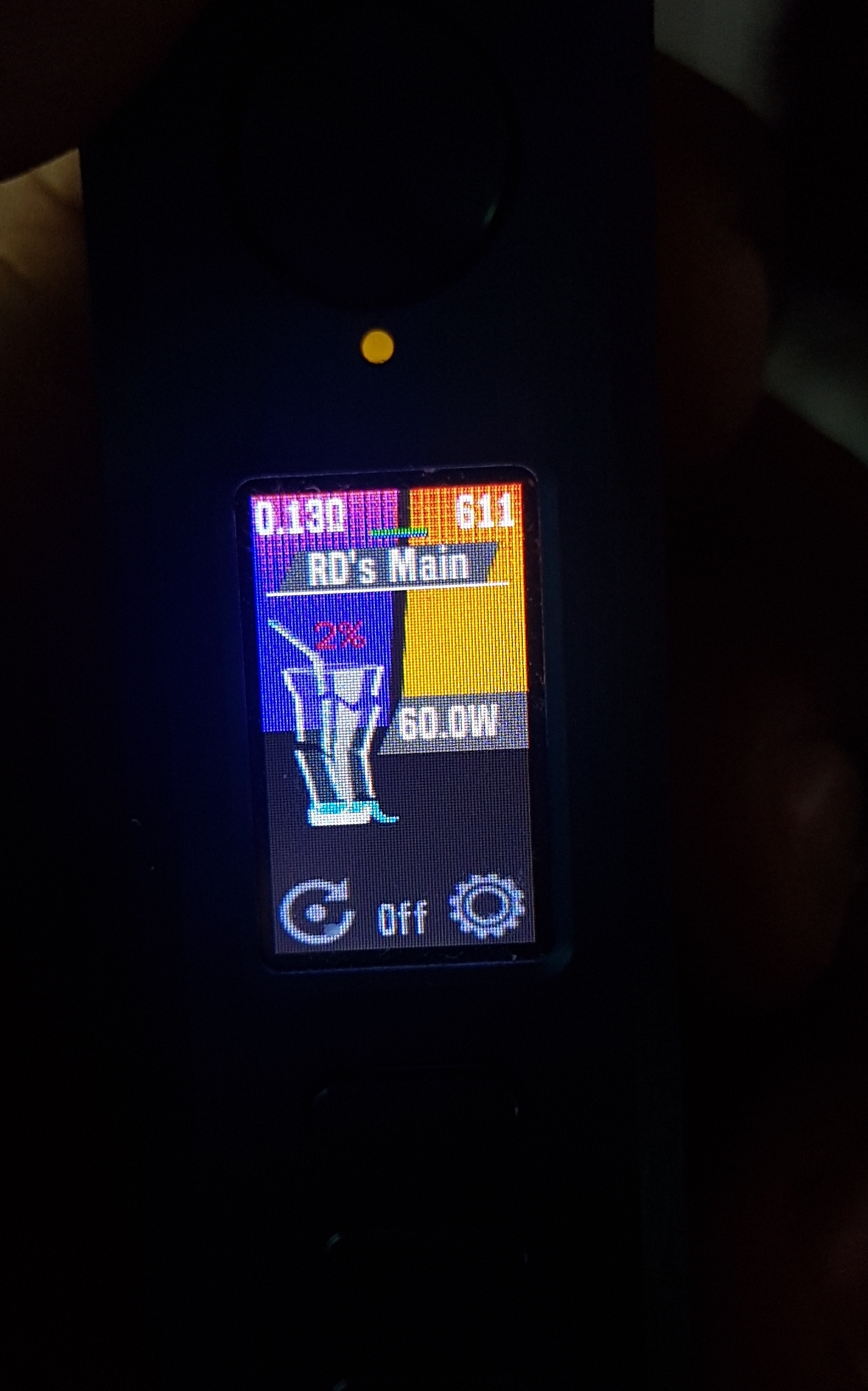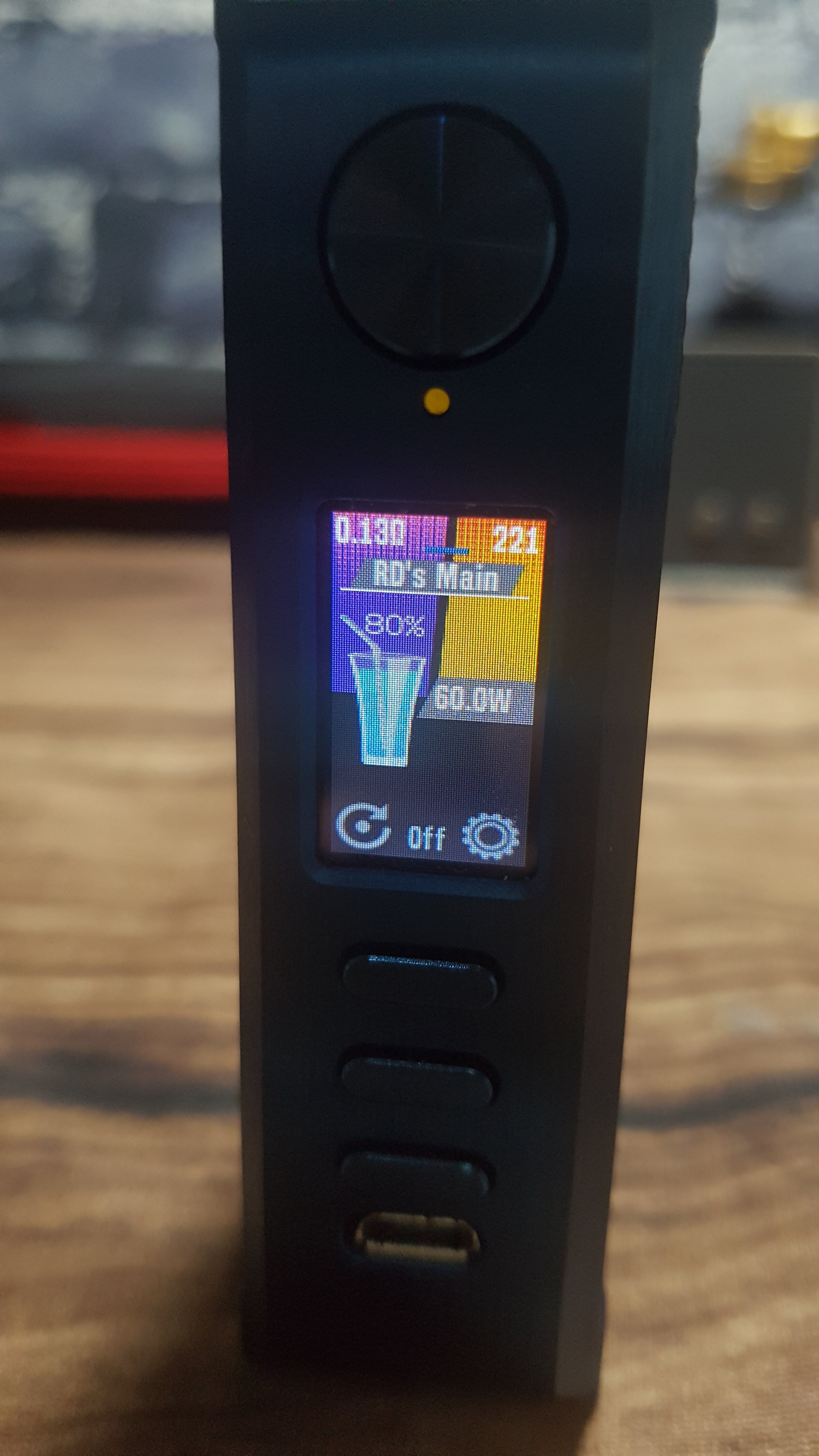 The main highlight is the glass of cocktail inside main screen. The cocktail reduces as the battery level goes down by 100% 80% 50% 30% 10% 5% and at 2% glass breaks. It has Replay on off, Puff counter and reset option on the main screen as well.
