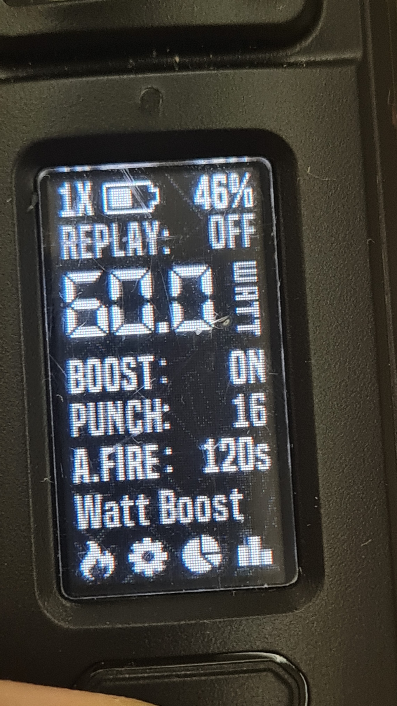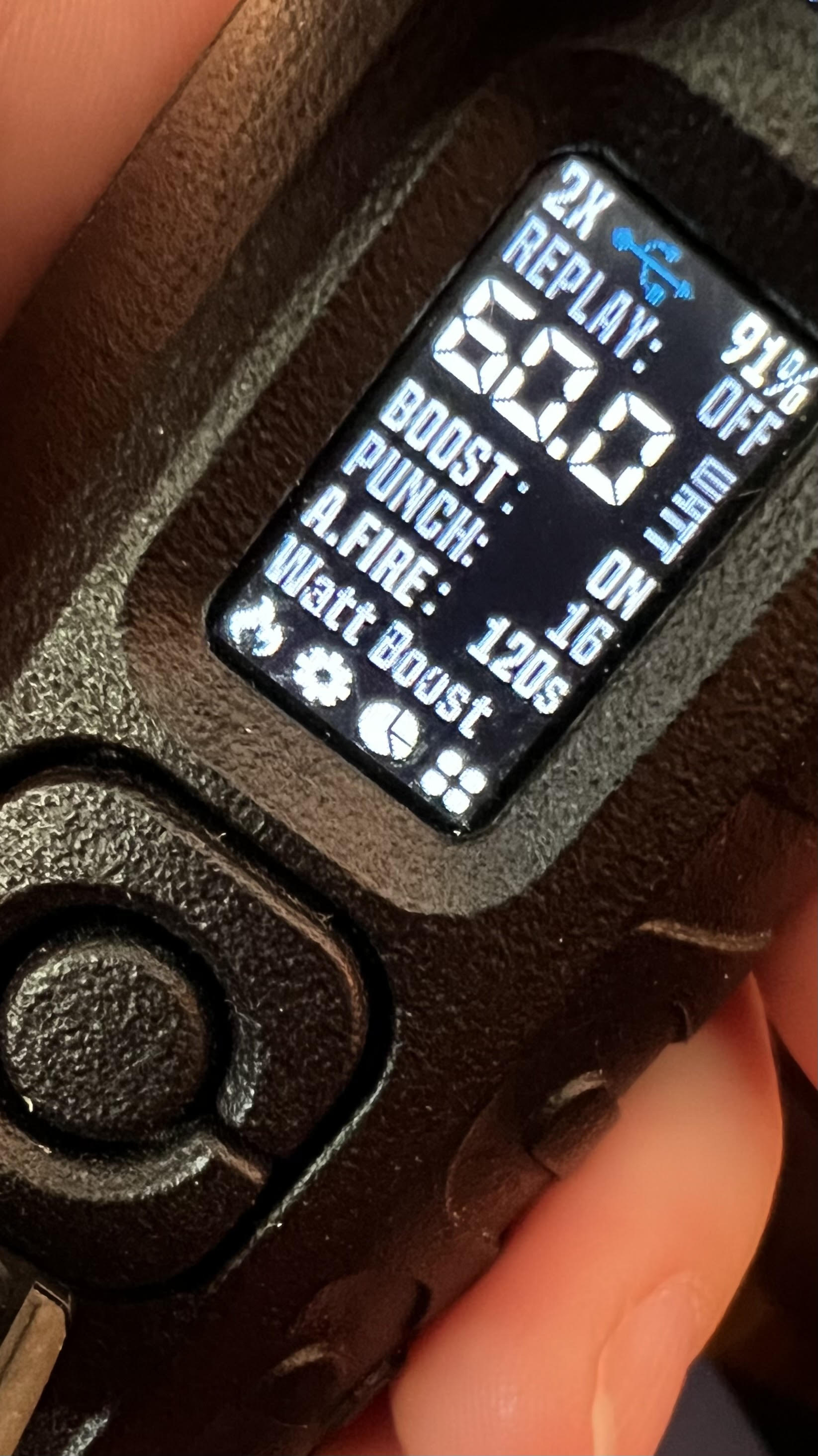 The power field is displayed in a large font that supports power, temp and replay modes. There is an icon in front of the coil material in Portrait & SG (replay text as a button on other versions) to activate the replay mode. By activating the replay mode, The power field gets smaller, the slider and other replay mode requirements are displayed (Replay Warmth, Lock and Playing).