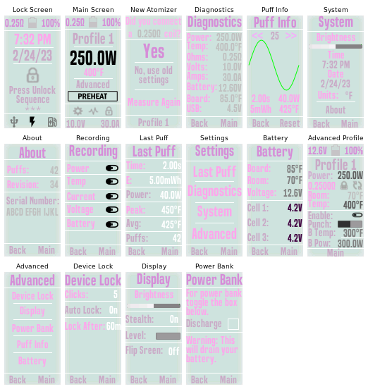 pink concept simple 1.4 .ecigthemeThis is an extremely advanced theme that has all of the latest and greatest features, including replay! Now that being said, it does have a very simple main screen to not deter casual users from an advanced experience, if you need to just relax and vape, the main screen is your friend, if you want to have a fine tuned experience, the advanced button on the main page will be your friend, as it involves every setting you could need!