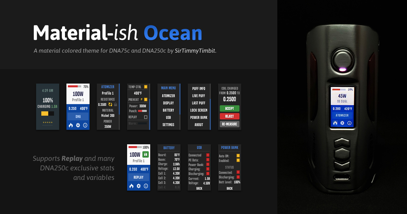 DNA75c now supports replay with the new international firmware 1.1 SP33.2 INT. As such I no longer need to maintain two separate versions of the theme. You can flash the same Material-ish Ocean 1.1.0 theme file on both DNA250c and DNA75c.