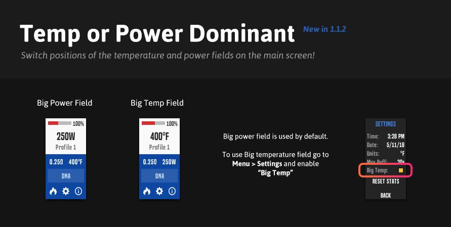 - You can now interchange the temperature and power field on the main screen. Go to Menu > Settings and enable "Big Temp"