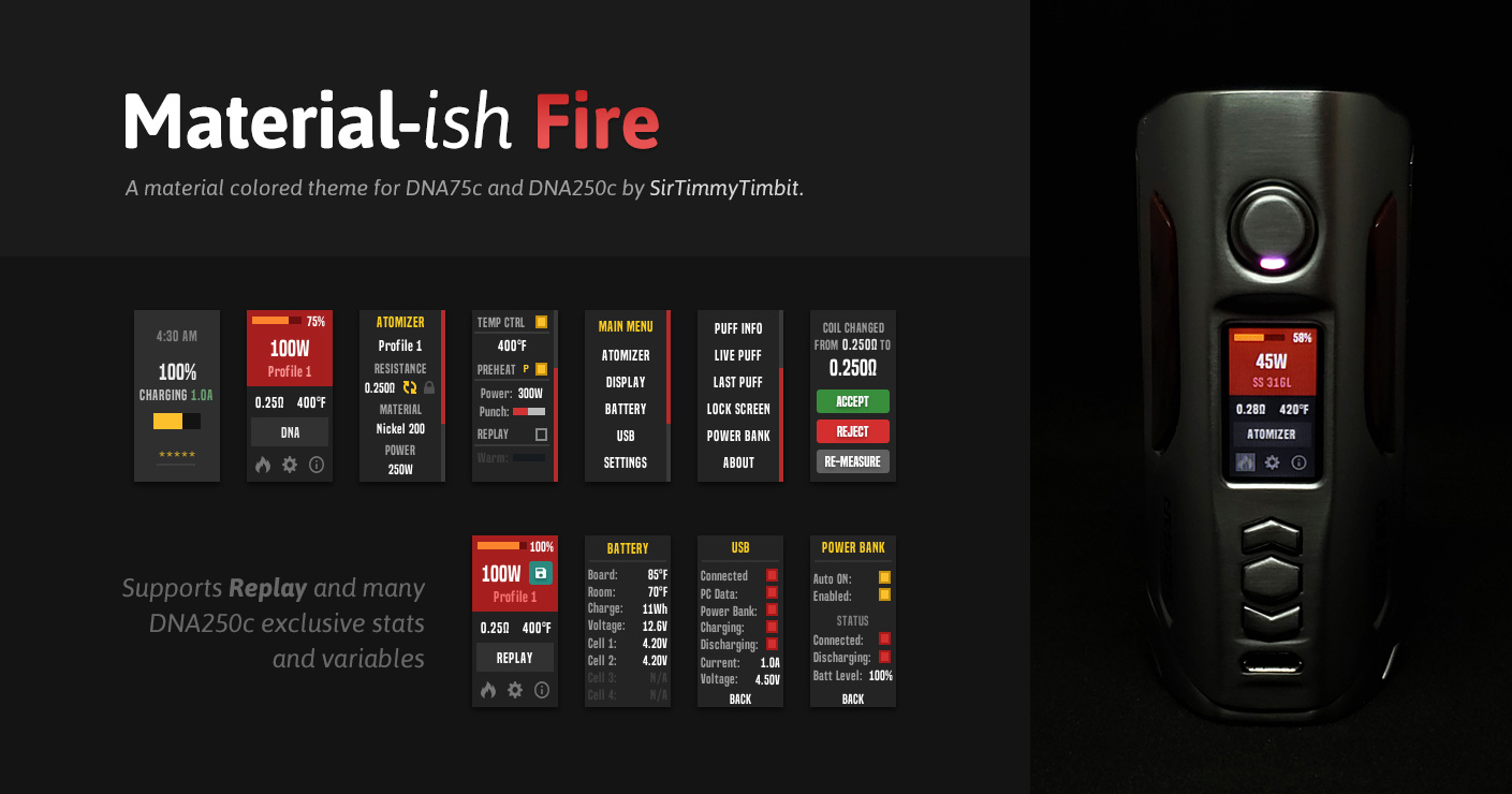 - When you change the material of a profile (eg. from Watts to SS316L) you won't have the appropriate toggles (eg. Temp Control, Replay) activated right away. You need to back out of the Atomizer Profile screen, fire the mod and go back into the Atomizer Profile screen. This is an Evolv/Theme Designer issue.