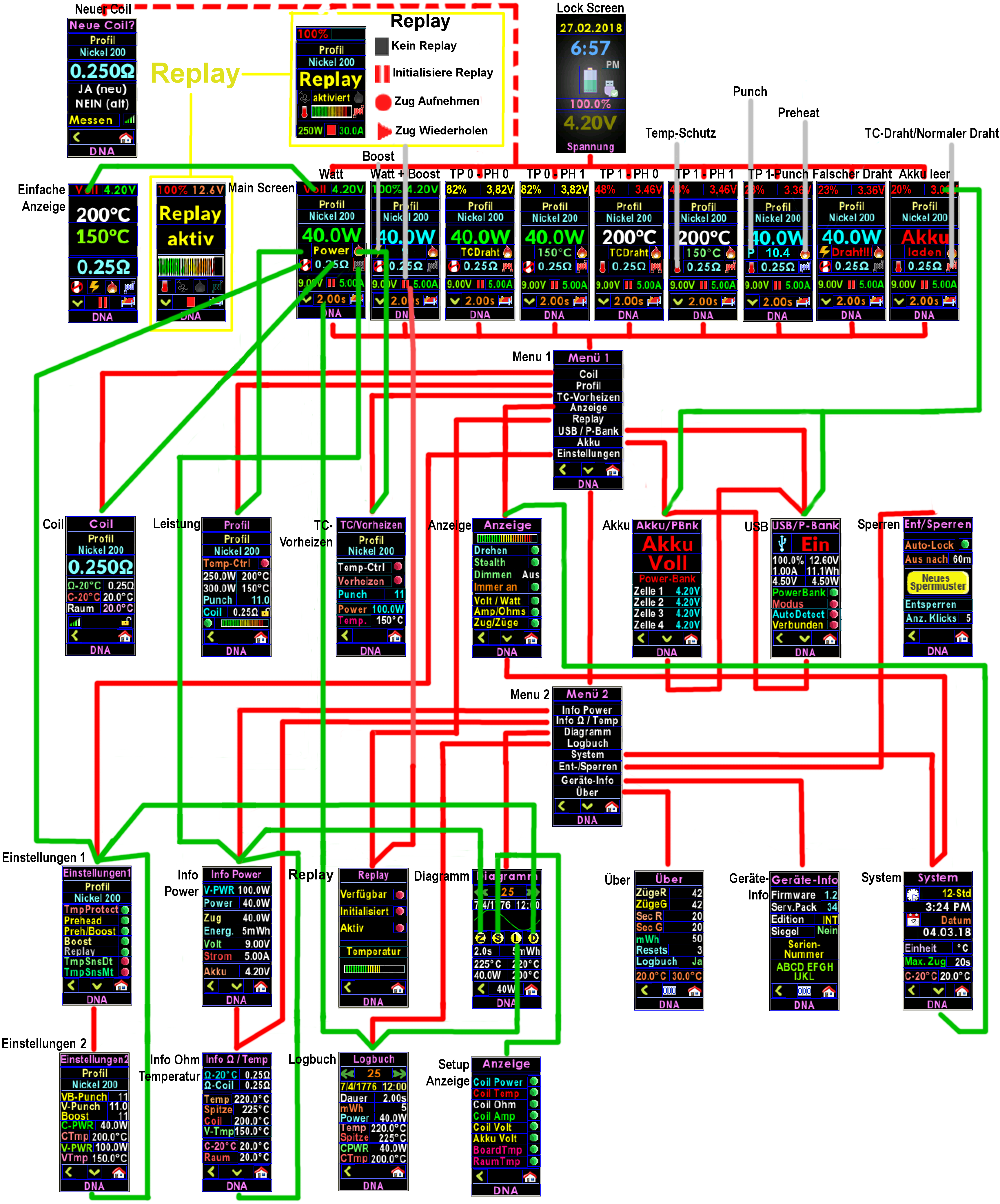 2.1.1 Kleinere und grössere Bugfixes, Verbesserung: "Mainscreen 1" Klick auf Spannungs-Anzeige öffnet Screen "USB" wenn verbunden, wenn nicht verbunden öffnet Klick Screen "Batterie" - graphische Balken-Anzeige für Batterie_Level jetzt auch mit "Akku leer"-Warnung und Klick öffnet Screen "USB" wenn verbunden, wenn nicht verbunden öffnet Klick Screen "Batterie", Screen "Menu 1" Eintrag "Profile / Coil" getrennt, Screen "Coil" komplett überarbeitet, Screen "Info Temp/Ohm" Eintrag "Board-Temperatur" hinzugefügt, Screen "Über" Eintrag "mWh seit Reset" hinzugefügt