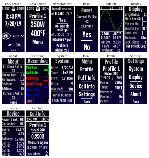 About Menu with Lifetime puff count, Theme revision, current firmware, current revision, edition, current puff count, puff count total energy, and reset to take you to a rest statistics screen.