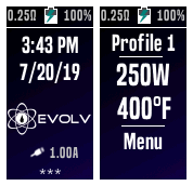 Profile Menu has added cold ohm temp with current ohm reading and coil material setting added. Also added is the availability to have advanced preheat settings with the Preheat+ toggle when temp control is active.