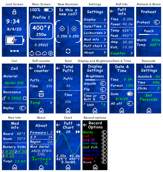 Ok, lets say your mod is now unlocked. These are the main vaping screens you're going to spend the most amount of time on.