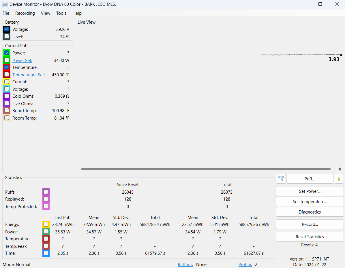 7. I need you to go into escribe (with mod plugged in) and do a screenshot of the profile you're using. When you start escribe you'll see 'current profile' and a number. Click below on that number then do a screenshot. Then start 'device monitor', ONLY enable TEMP, TEMP SET, POWER, power set. Take a puff, pause the screen. And then do a 2nd full screenshot screenshot instructions in my signature line.