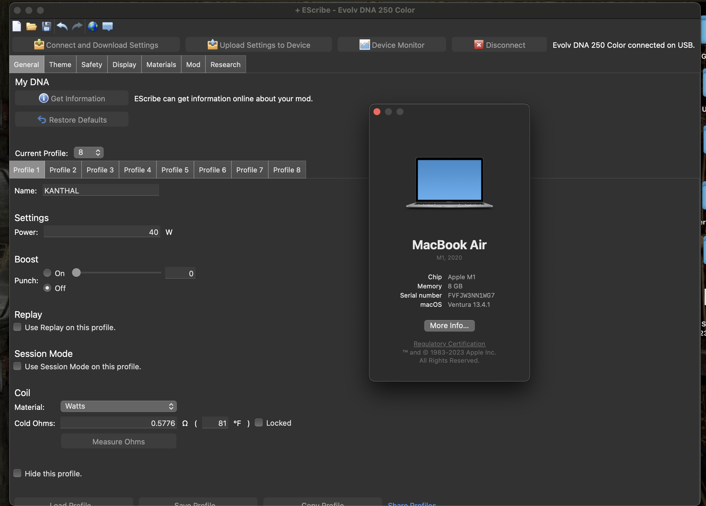 21. I have no clue what that value is denoted by 'T' but if it's supposed to be TCR then it's Kanthal. NOT controllable. The minimum controllable material TCR is ~0.0008. Those 'cold ohms' also seems wonky. You're showing ~50% difference just on cold ohms, before heating. Thinking about how TC works, a increase from .31Ω to .70Ω is a whole lot different from .46Ω to .70Ω Here's what I'd like you to do WITH A COLD (ambient) SETUP. Start escribe. Find (left hand side) where it says 'Current Profile' Just below, click the Profile number from above. Scroll to the bottom of the page. Start 'atomizer analyzer'. Take a screenshot (link in my signature) Watch that for about a minute, and tell me the low and high values. Close that screen. Start 'Device Monitor'. On the left hand side enable/click these four (4)boxes Voltage, Power, Cold Ohms, Live Ohms. Find where that Pause icon is on the right hand side, just below the graph. Take a puff then pause the screen. Take another screenshot Post those 2 screenshots. Your 1st screenshot should look exactly like this.