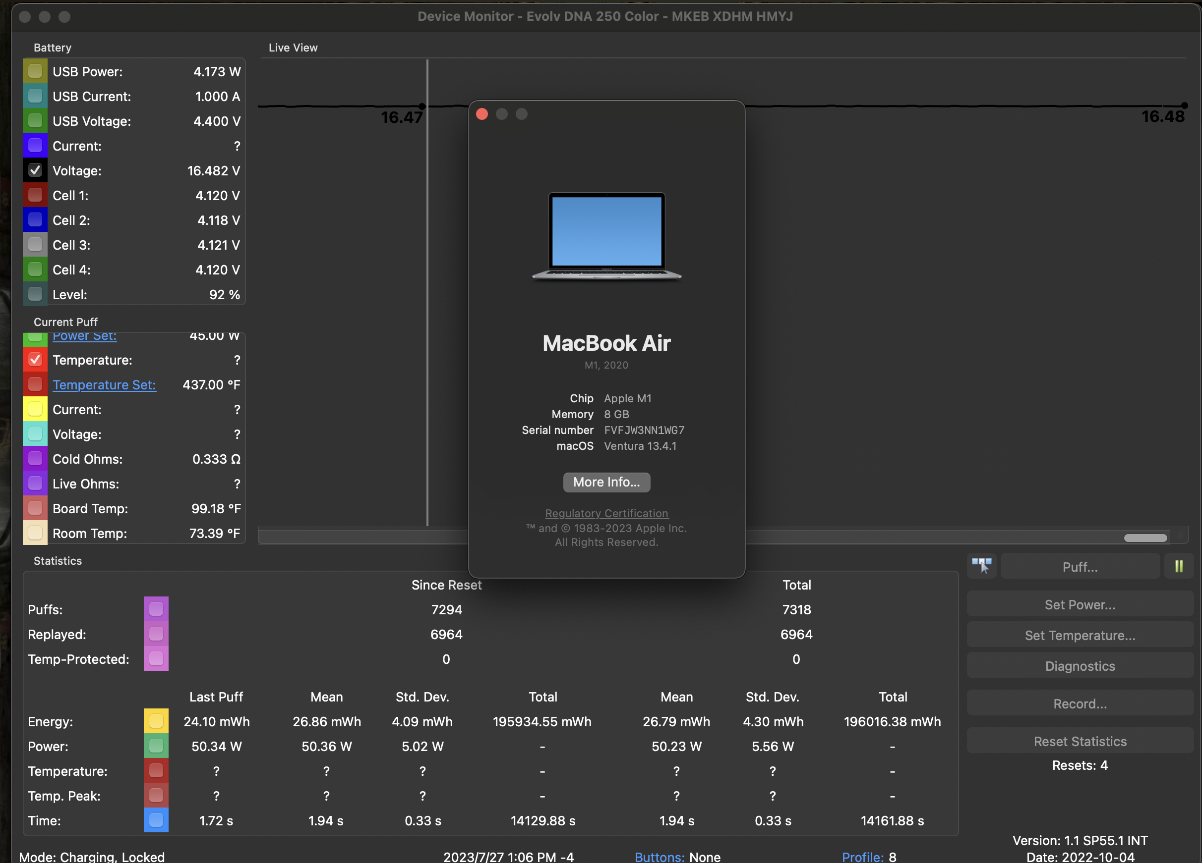 17. Are my battery stats normal? I would say probably Yes. I don't know the standing battery voltage (before firing), so when it drops to 3.88V while firing is anybody's guess. Using all the values in the 'current puff' area and simple ohm's law, it looks good to me. What kind of tests would you want to run? Before leaving the factory there are only a few functional tests done. A firing test at about 70% max power, where they look at voltage drop AND a battery test that your mod will charge. You can see that yourself. If you look at your Total Puffs there's 218. Looking to the left you see 'Since Reset' which shows 211. Over on the right hand side, just above the firmware version you'll see 'Resets' 1. Those missing 7 puffs were during testing.