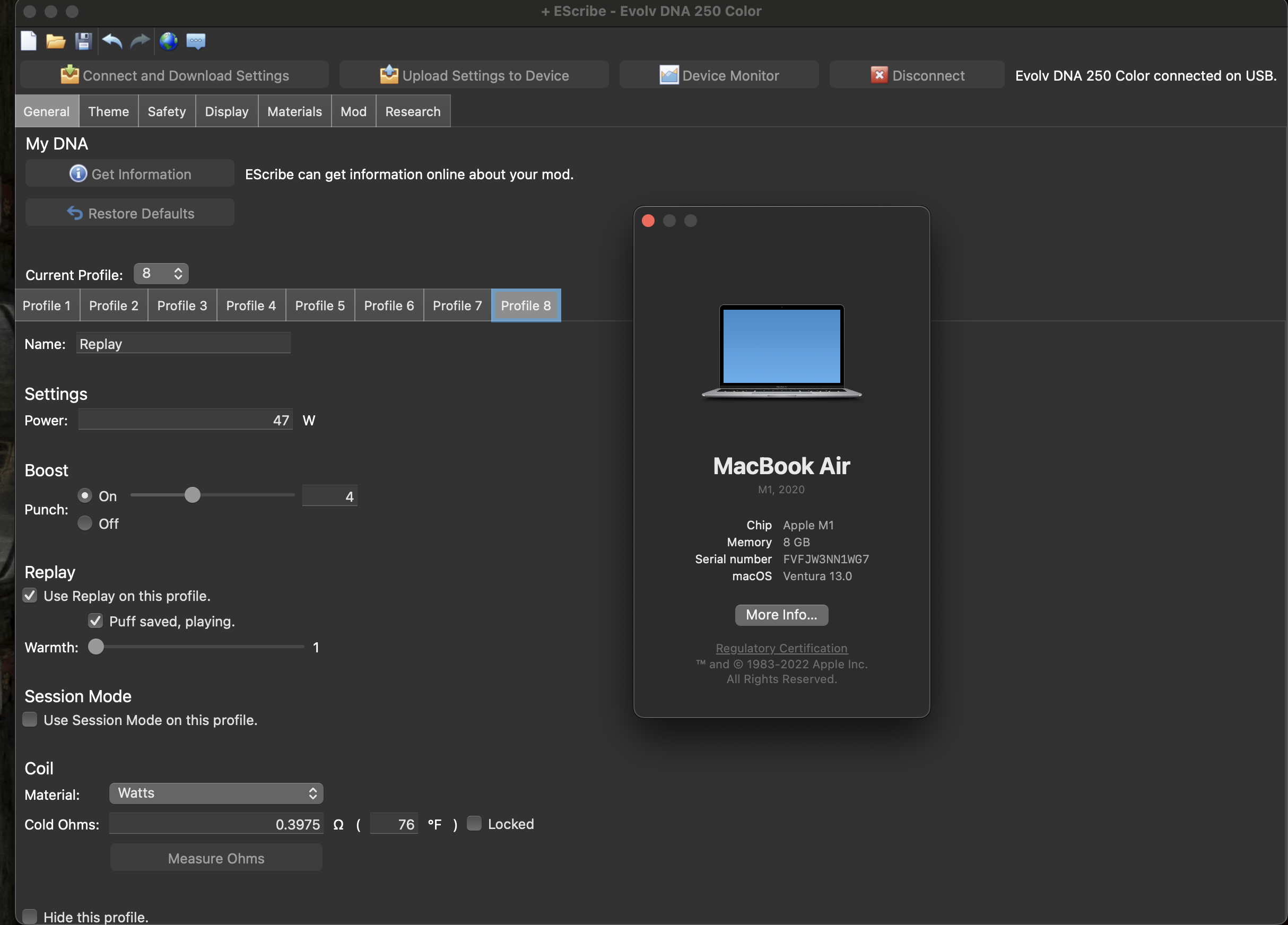 11. I have no clue what that value is denoted by 'T' but if it's supposed to be TCR then it's Kanthal. NOT controllable. The minimum controllable material TCR is ~0.0008. Those 'cold ohms' also seems wonky. You're showing ~50% difference just on cold ohms, before heating. Thinking about how TC works, a increase from .31Ω to .70Ω is a whole lot different from .46Ω to .70Ω Here's what I'd like you to do WITH A COLD (ambient) SETUP. Start escribe. Find (left hand side) where it says 'Current Profile' Just below, click the Profile number from above. Scroll to the bottom of the page. Start 'atomizer analyzer'. Take a screenshot (link in my signature) Watch that for about a minute, and tell me the low and high values. Close that screen. Start 'Device Monitor'. On the left hand side enable/click these four (4)boxes Voltage, Power, Cold Ohms, Live Ohms. Find where that Pause icon is on the right hand side, just below the graph. Take a puff then pause the screen. Take another screenshot Post those 2 screenshots. Your 1st screenshot should look exactly like this.