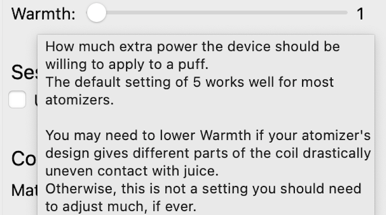 escribe shows this about 'Replay' when not enabled Only if you click on Replay do you see this Warmth is a Replay feature, not a Temp Control feature. But like @BillW50 said, use Device Monitor with relevant fields selected to see changes to your puffs