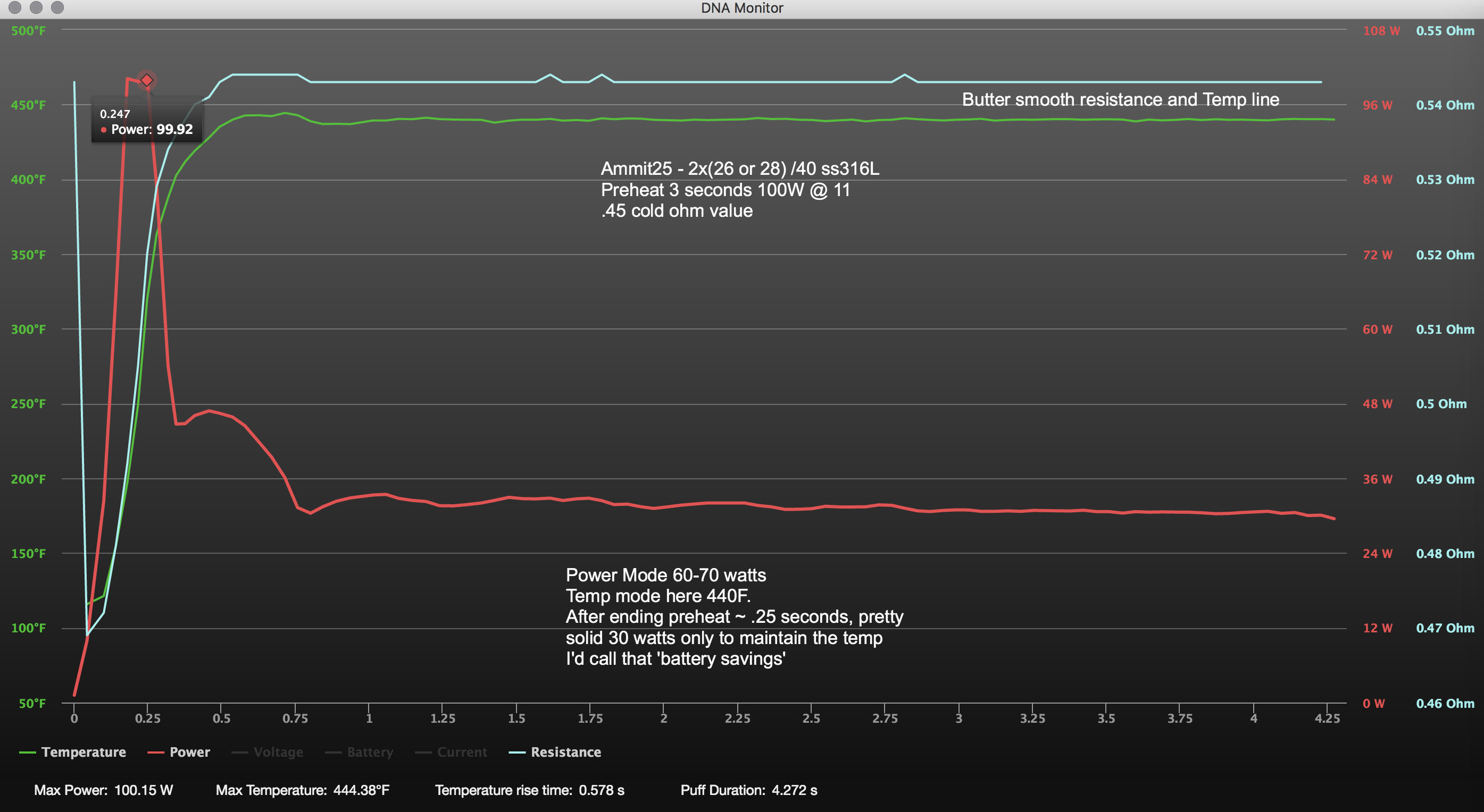 This was not from escribe, but shows my battery savings compared to straight watts. 70 watts set as max power Great coil pics by the way. I tried so hard to get some of my Wasp, but unsteady hands. Sorry if the pic is massive, I can't be bothered to resize. -