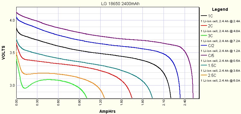 DNA devices have a Weak Battery feature, where as the battery voltage sags due to inability to deliver the desired power, it will lower its demands until the battery can meet it. So, a lower current battery may appear to work. It may, however, begin to show Weak Battery at a higher percentage of charge. This isn't a failure on the device's part -- the battery just can't deliver. (As an aside, many people lower their Soft Cell Cutoff thinking it will give them more battery life. This is lowering Voltage 5-10% to increase Current hours by 2%. Nobody is vaping Current. Power is Voltage x Current.) A good, high current battery will cost $7-8 these days, while a lower current battery will cost about $5, and a horrible battery will cost about $3. So up-front a high current battery will cost about $3 more each. Keep in mind, though, vaping is a fairly high power pulsed load for a battery. Let's look at two batteries... (1) Samsung INR18650-25R is a 2500 mAh battery, and will give you 2400 mAh at 30A. (See page 9 of the datasheet I've attached: INR18650-25R-datasheet.pdf) It's a power tool battery. (2) I found this on Google Image Search for 18650 battery. No idea what battery it is, but judging by the appalling current, it's clearly prehistoric. Probably $2 on eBay these days: If you vape three of these in a DNA 250, you might get 60W, and you'll get under half the rated capacity. This is rated at 2400 mAh. And that's not wrong. It's just a flashlight battery. When you vape up near a battery's limit, it's going to be generating a lot more heat. This is lost power. The battery may also have reduced cycle life, meaning it will lose the capacity it does have more quickly as the year goes by. So you'll have to get a new one sooner, and then you haven't saved money. Underspecified batteries are a false economy. For vaping, you want a power tool battery, not a flashlight battery. For a DNA 75, by the way, due to it being 1-cell instead of 3-cell, the battery needs to deliver three times as much current for the same power setpoint. So for 75W (or 75W preheat at a lower power), you need a really good battery.