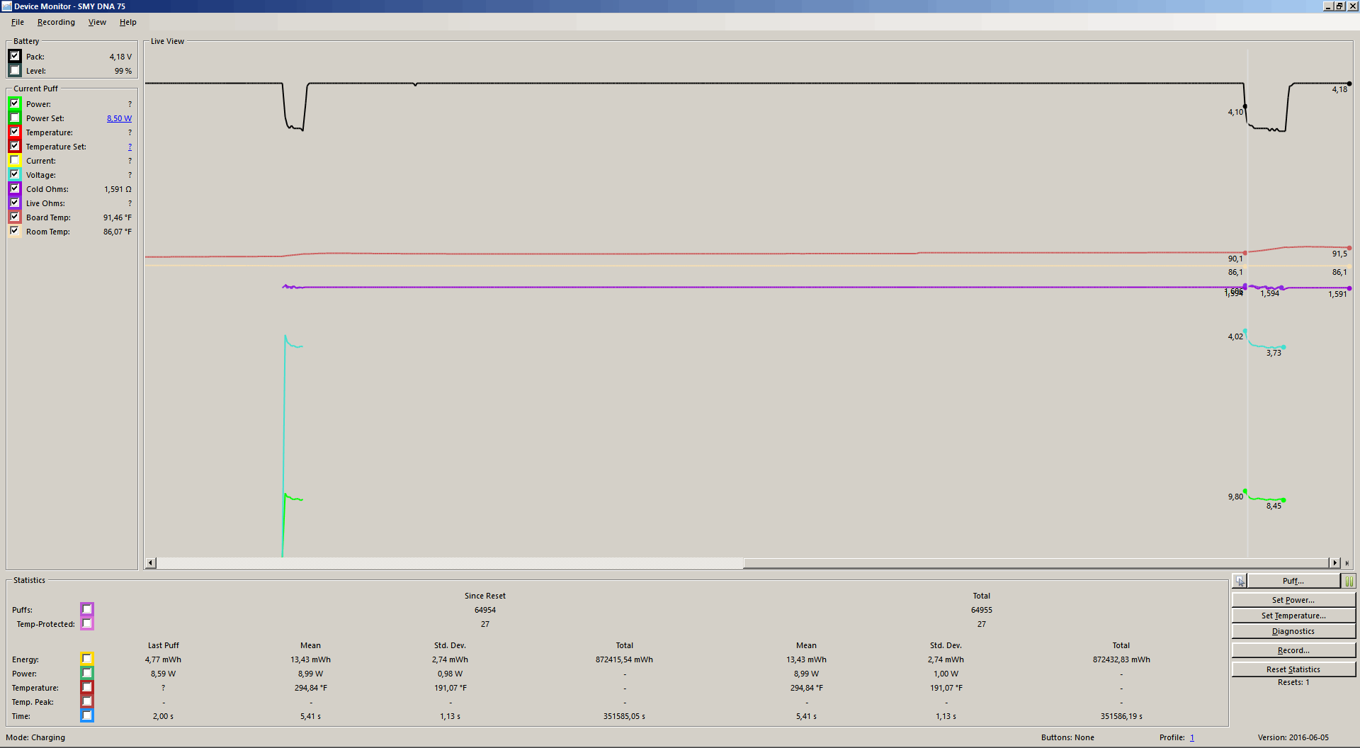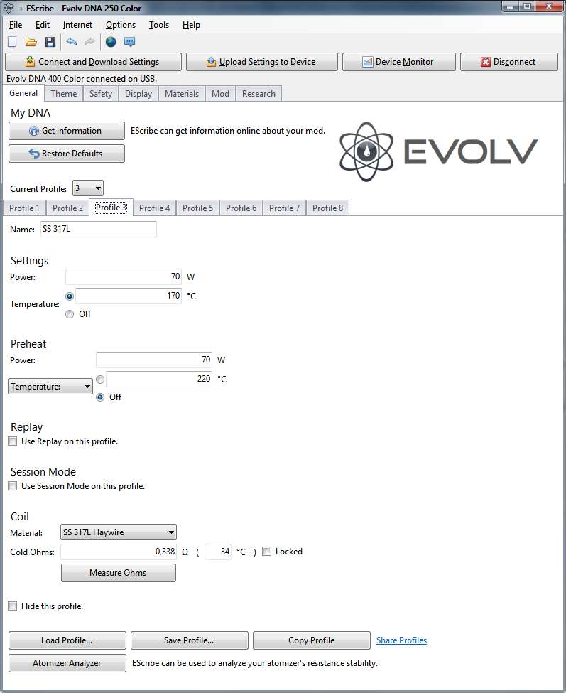 Here are two graphs from device monitor, one when cold (was working until seconds ago, just refilled e-juice), and one after I "persuaded" it to work by raising the temp to 230 C. Both graphs are at 170 C, didn't include the temp set and many other parameters for clarity. Interestingly, I can't see the temperature on the graph, not sure what is happening here, I think I saw it earlier. Maybe it really doesn't detect the coil as temp sensing? Just in case, I am also attaching the profile settings. Mod resistance is 0,0065 ohms. Cold.csv Warm.csv As a side note, not connected (only) to this case, I notice that the room temperature as reported by all my DNA devices is always around 6 to 8 degrees Celsius higher than actual. I have performed thermal calibration on all of them and after that they work better in temperature mode, so that tells me that I am not doing something terribly wrong. -