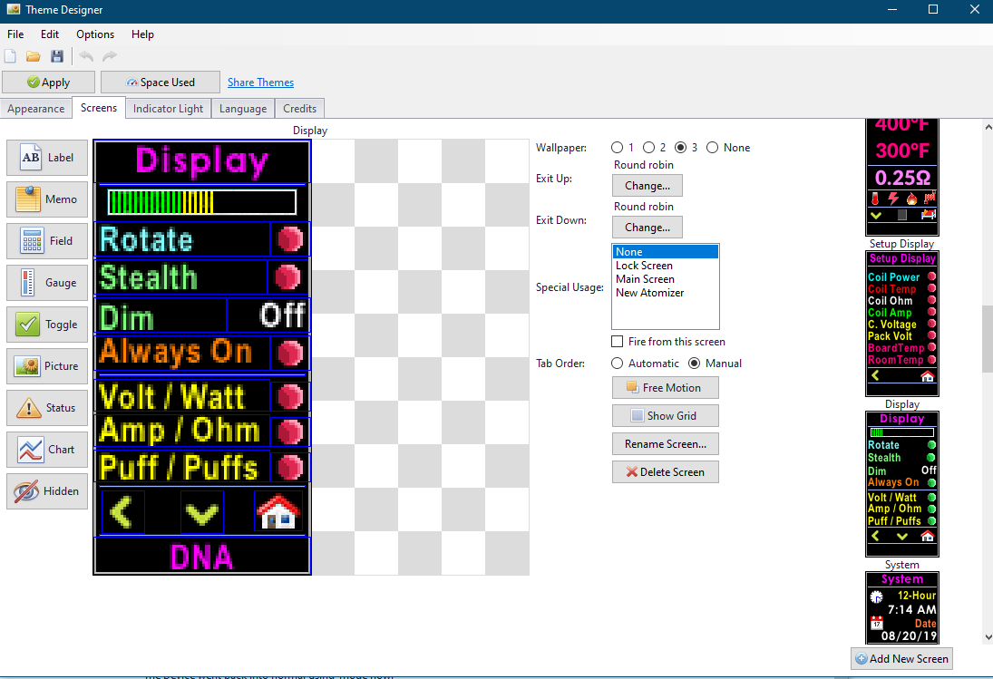 I am not versed in designing Themes but if possible and if the functions you want are available for a theme they would need to be designed into the Theme. You might look at the design of your theme and see if Stealth is already there. There are numerous Themes in the Downloads part of this forum where you can look at the screens and functions and choose the Theme you want. I recommend you save your current theme before changing to another in case you want to go back to Lost Vape Theme. Here is the link for 75C and 250C Themes: https://forum.evolvapor.com/files/category/6-dna-75-color-250-color/ -
