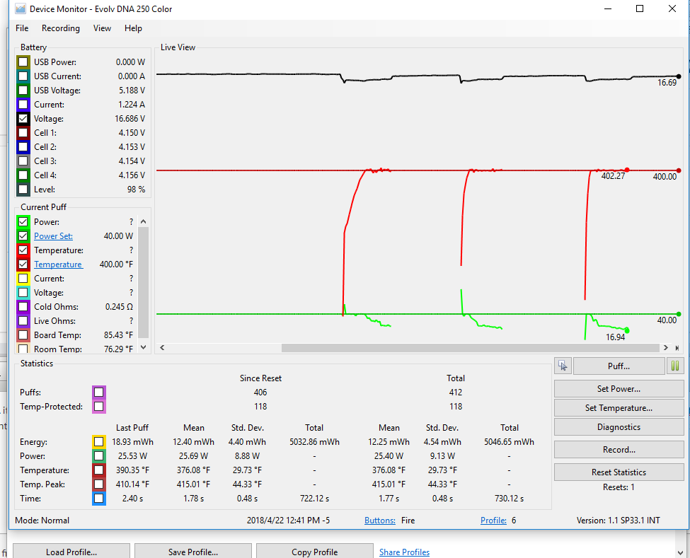 BadNews.... it looks like you need to turn up the power (watts), say to 45 or 50..... preheat should be OK at 375F.... From the screenshot after the preheat reaches 375F it shuts down and the power wattage continues. Your reaching 35 watts of power and the temp is only raising slowly toward your set temp.... raising the wattage to 40/45/or 50 should allow it to reach the set temp of 450F. Here is a screenshot showing my vape setting the power and preheat to the right settings to get a quick rise during preheat and achieving the set temp quickly..... Keep working at the settings and you will get there... -
