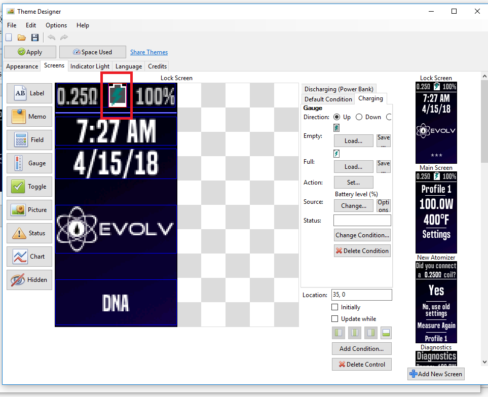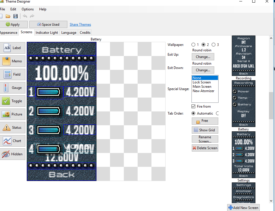 Cabbage Evolv Light and Cabbage Evolv Dark theme (the newest versions), found in the Downloads Section has a Battery Screen that Shows Total Voltage, Voltage for Each Cell, and Current output Amps of last vape. It is real time in both Non-Charging and Charging State. Also when vaping you are at the Main Screen and while not charging you can select Battery and it will jump to the Battery Screen and you can see the state of all batteries, Select Back and you are back to the Main Screen.... One of the best themes I've used...... Works with 75C and 250C Screen shot from Theme Designer of Battery Screen ..