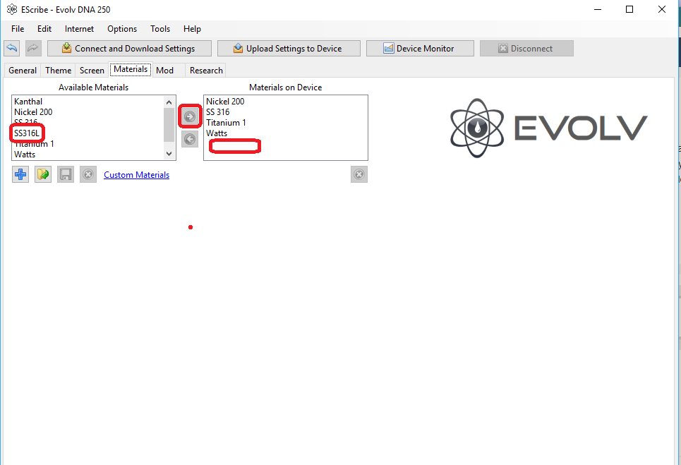 In EScribe you add SS316L to the Material on Device side and upload to the device. Select SS316L as the material when setting the Profile...