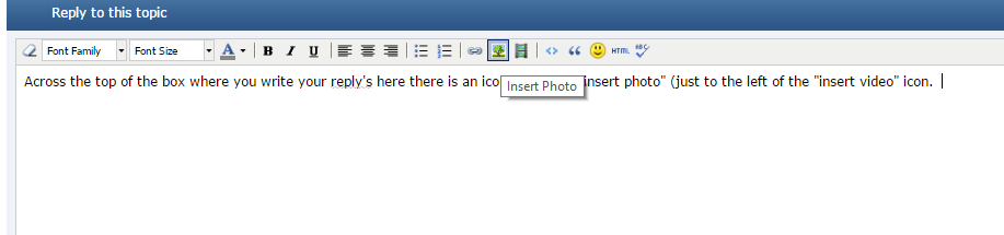 Click "more reply options" first. Across the top of the box where you write your reply's here there is an icon to click to "insert photo" (just to the left of the "insert video" icon.