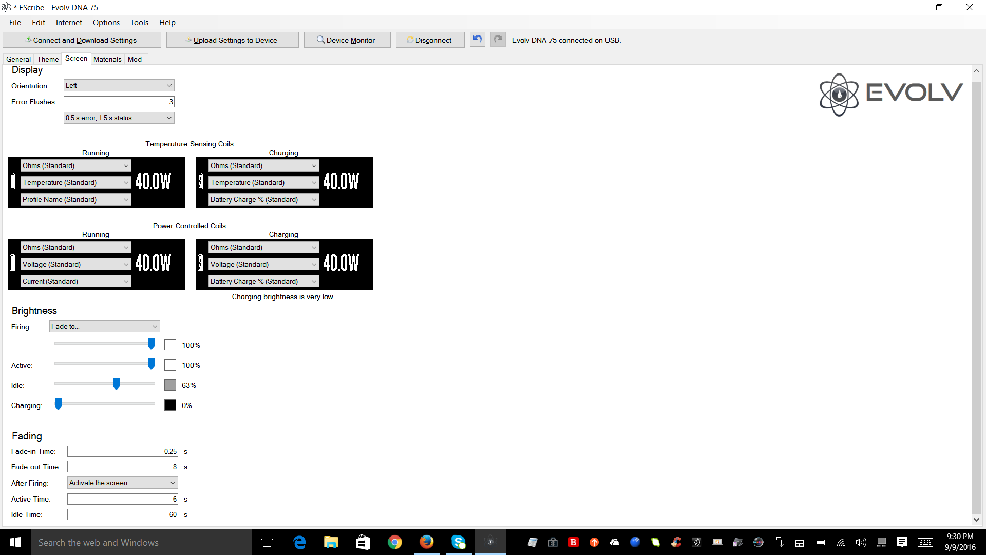 Ok, I am doing the same thing here as you are doing there. When plugged in to charge it is doing what it should and you should see a red LED light (and lightning bolt) while charging turning to green (and no lightning bolt) when charged. With the Charge brightness set at 50% and not plugged in to charge the screen should go out after 60 seconds or so. So the original ecig file that came installed in the device has not been changed? If it has then it may be the ecig file you installed may have an issue. If the ecig file wasn't replaced from the original then you may have a board issue. That's my best guess from what you are seeing. Has it done this from the start as a brand new device? What device is your DNA75? -
