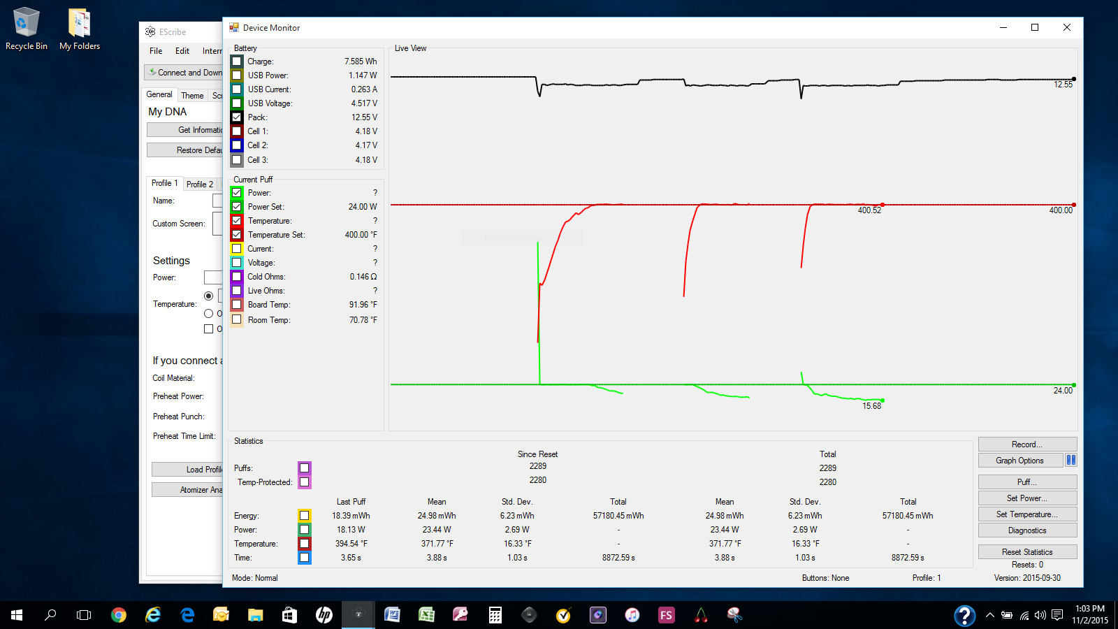 I run the 0.15 ohm nickel Aspire coils at 24 watts, 400F, 100 watts preheat and all is well. Can you post a screen shot of Device Monitor showing Pack, Power, Power Set, Temperature, and Temperature Set showing 4 or 5 consecutive vapes so we can see what it is doing. Snap[ of what I get: