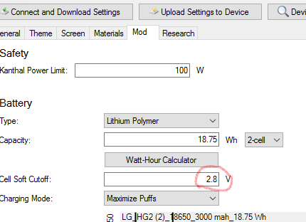 The factory settings are kinda set on the Skar 75. Seeing that not every device is identical, even of the same brand/model, it is always wise to run the analyzers & mod resistance test for oneself. If you want to look at the factory settings,download this .ecig file... Factory_Skar_75.ecig ...once you download Escribe, open the 'Evolv DNA 75' version...go to 'File>Open & load this file into the software....IMHO, the Skar 75 is a solid device...I have 3 (one of each color) & use them daily Factory_Skar_75.ecig