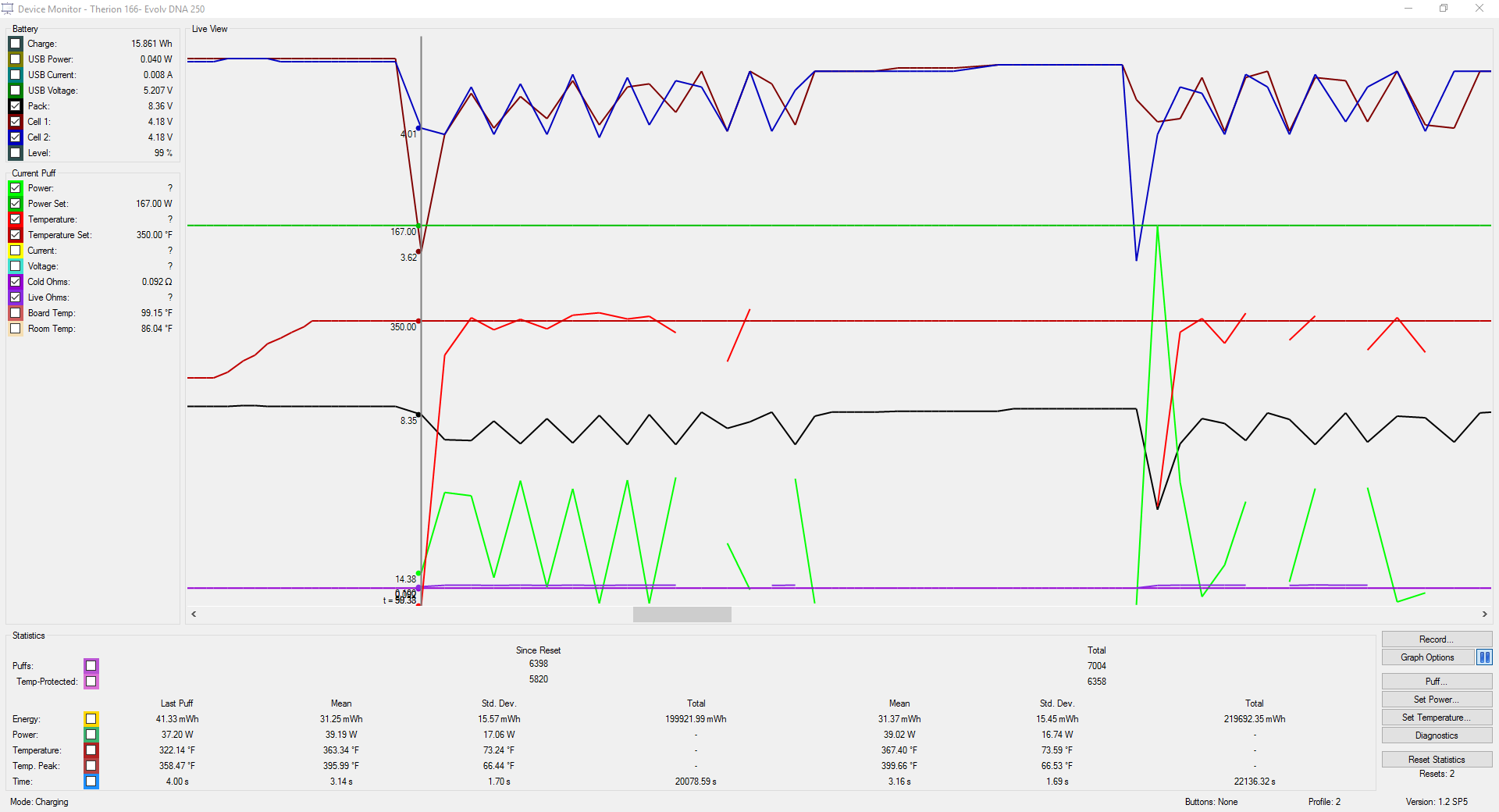 16. Hey guys...have noticed a few times that I could feel the pulsing of the device & temp rising & falling. Was finally able to catch it on Device Monitor. Seemed like every time I tried before, it would clear up. This is on a Therion 166, 250 chip, SC Aromamizer, dual coil, 24g, 316L, about 6 or 7 wraps & clocking in at .09 ohms. In the screenshots attached, you can see the fluctuation when at 350F, but when I cranked it up to 375F, the fluctuation stopped. The third screenshot shows when I cranked it up to 375F. Every thing bounced around with it except for the cold & live ohms. Atomizer analyzer showing stable build. Checked all connections, etc... Any ideas? Edit...It has happened on different atty's as well, not just this one