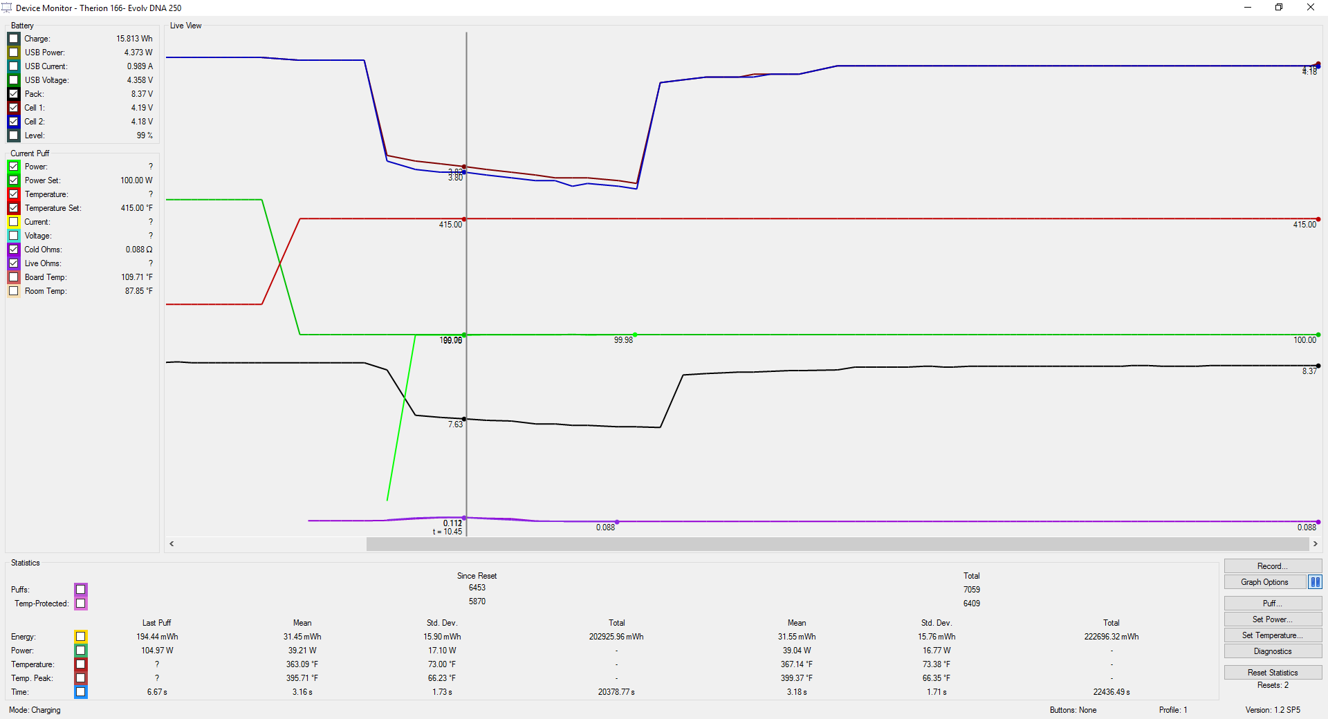 10. On the left side of this screenshot is the previous 10 sec. puff using device monitor & on the right side is me pressing the fire button