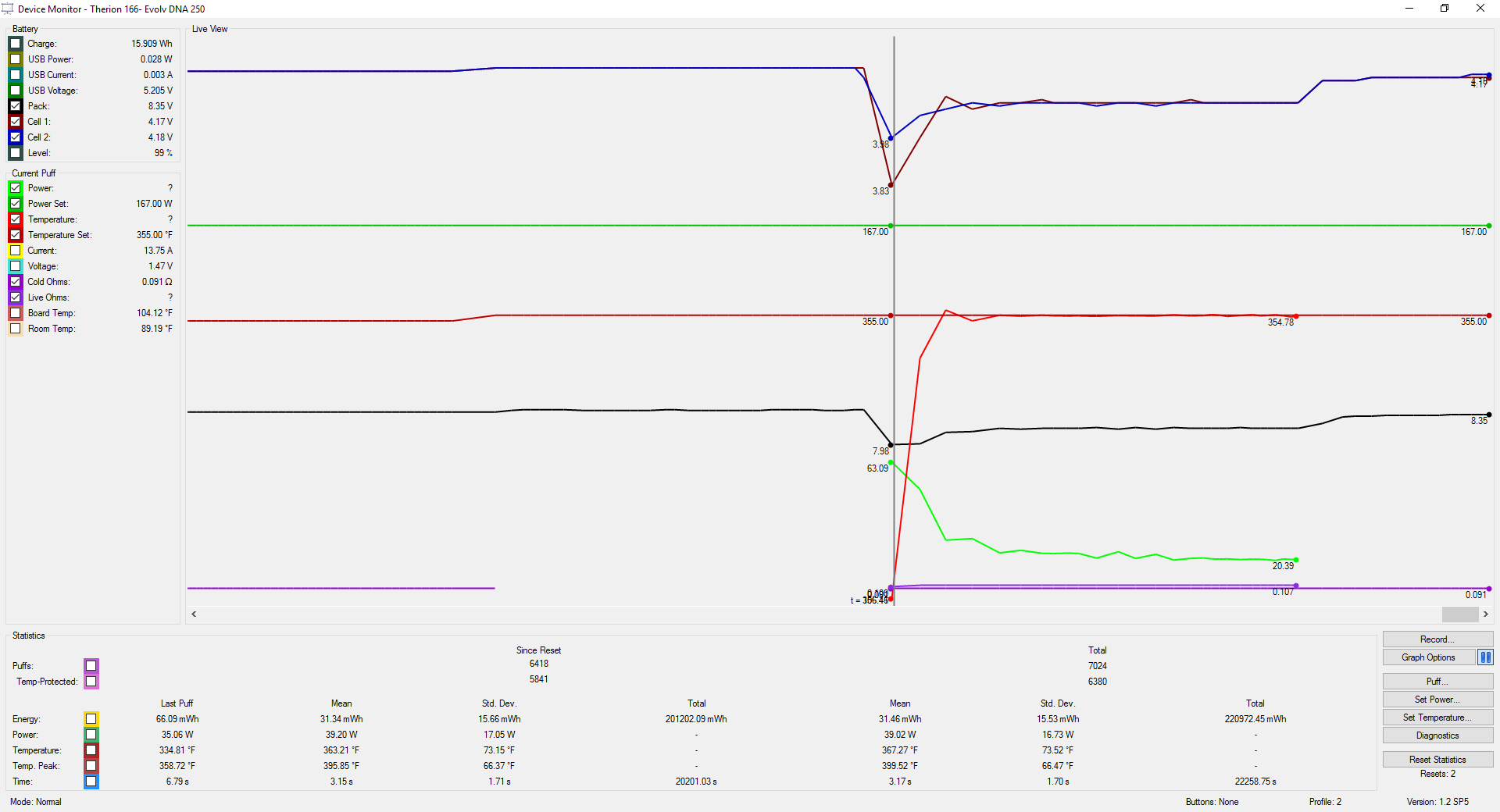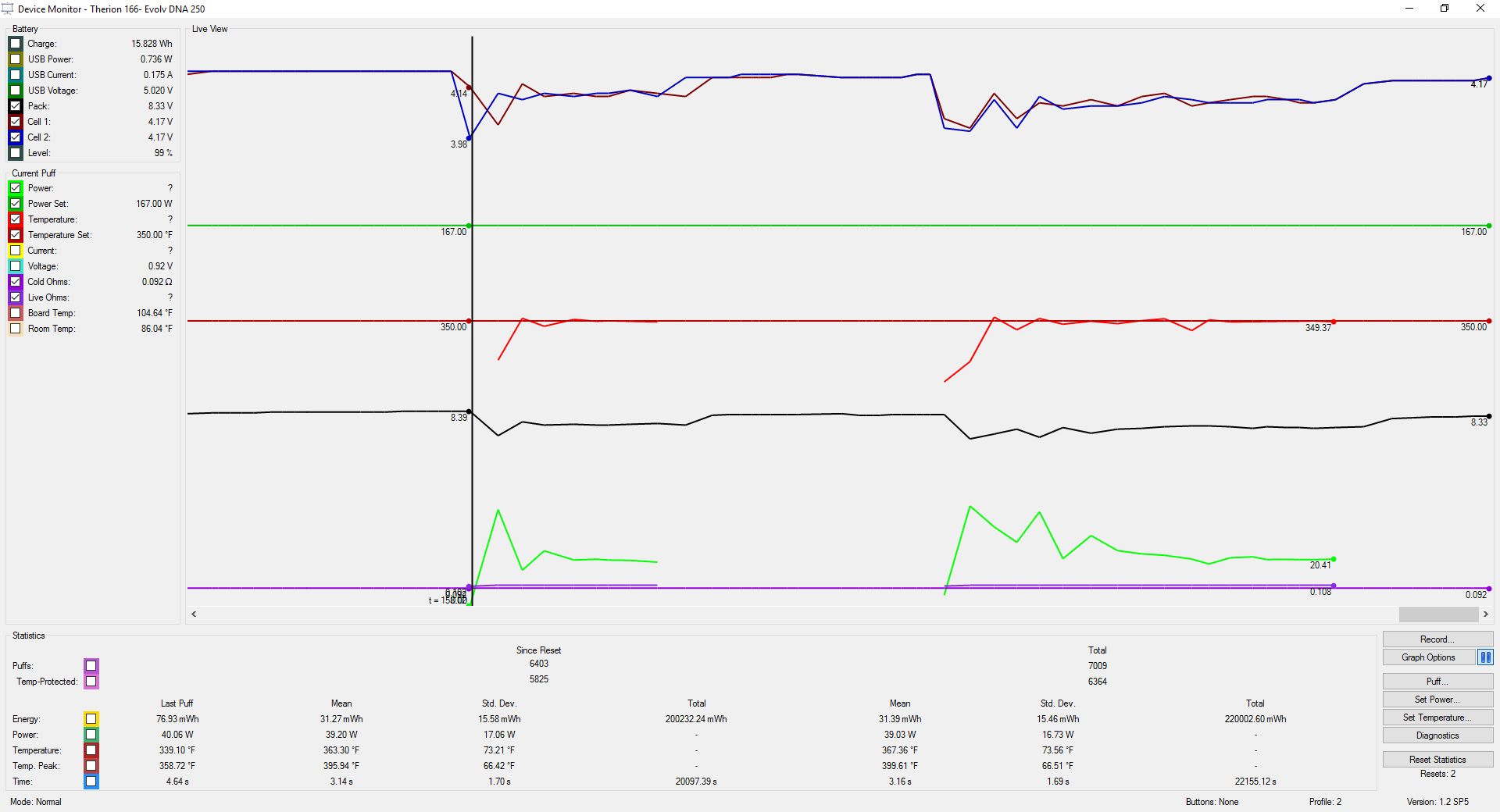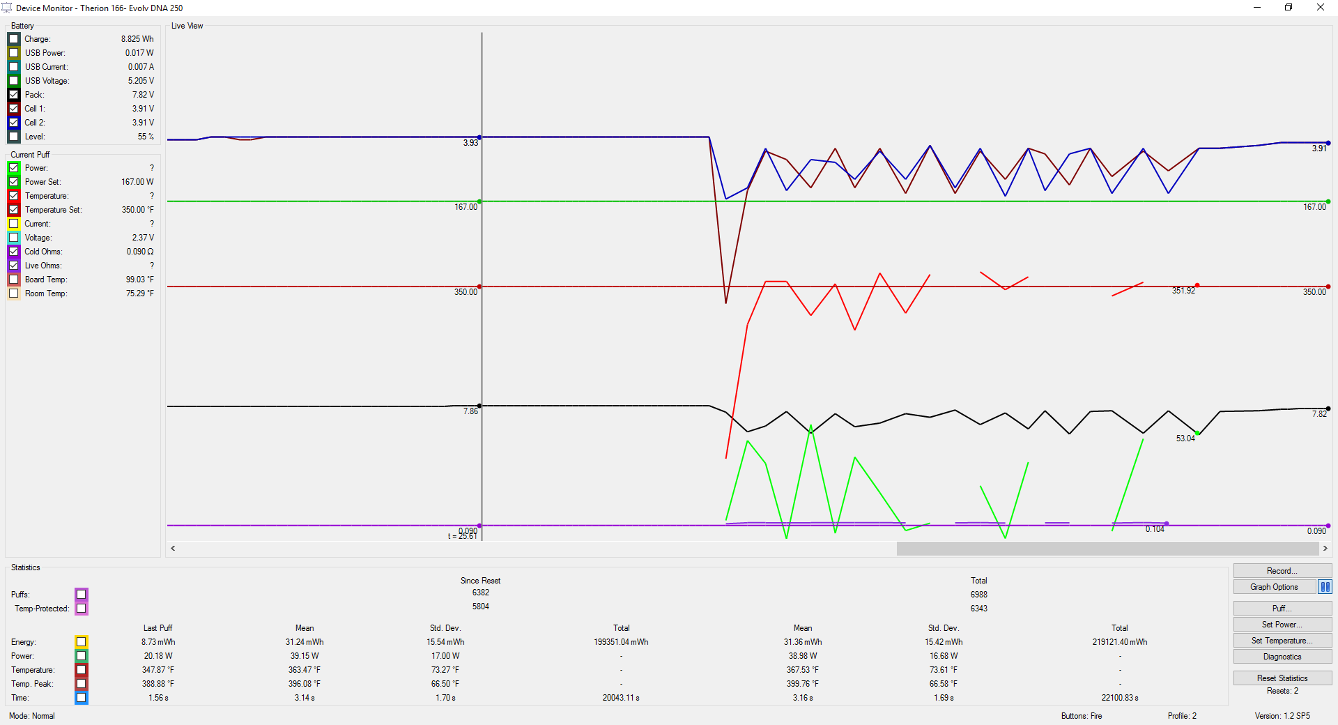 Hey guys...have noticed a few times that I could feel the pulsing of the device & temp rising & falling. Was finally able to catch it on Device Monitor. Seemed like every time I tried before, it would clear up. This is on a Therion 166, 250 chip, SC Aromamizer, dual coil, 24g, 316L, about 6 or 7 wraps & clocking in at .09 ohms. In the screenshots attached, you can see the fluctuation when at 350F, but when I cranked it up to 375F, the fluctuation stopped. The third screenshot shows when I cranked it up to 375F. Every thing bounced around with it except for the cold & live ohms. Atomizer analyzer showing stable build. Checked all connections, etc... Any ideas? Edit...It has happened on different atty's as well, not just this one