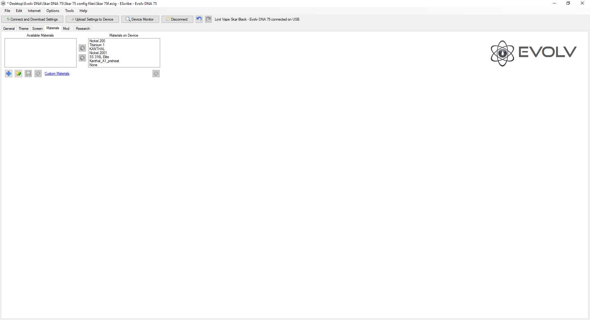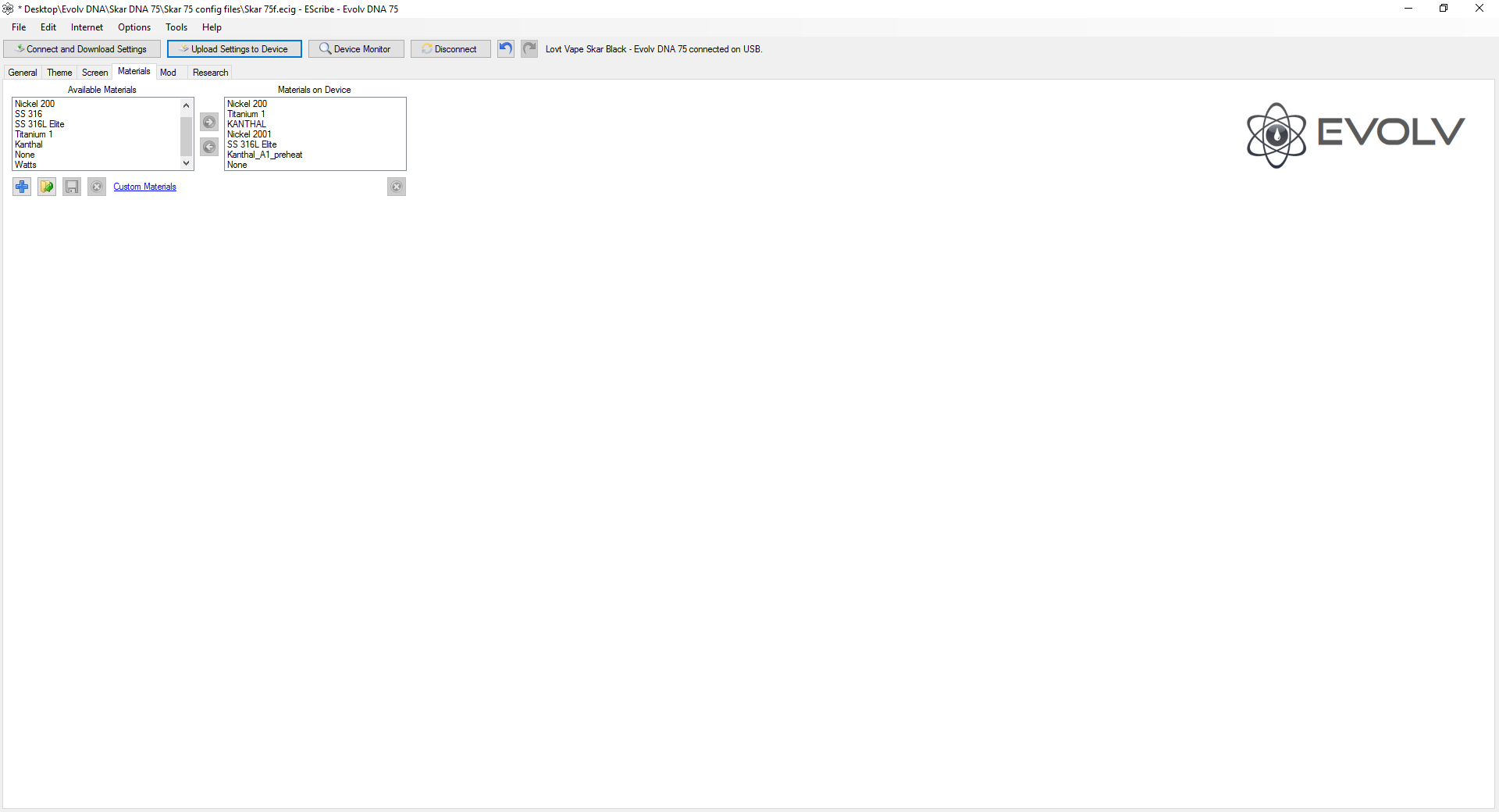 I save the .ecig files for the device & for Escribe every time I make any changes so as to be able to roll back to previous settings in case of a major mistake or something I didn't like. The materials I am trying to delete, from the 'Available Materials' list don't even show up as an option when setting up profiles because they are not on the 'Material on Device' list. These are a couple of materials that I will never use & was wanting to just remove from the 'Available Materials' list. When I realized that deleting them wasn't working, I tried renaming them instead & even that didn't work because upon restarting Escribe, the names were reverted back to the names prior to my changing them. If you take a look at the screen shots again, you will see that I am attempting to remove...SS316 & watts. If I delete or rename them in the 'Available Materials' list, when I restart Escribe, they are back as before. -