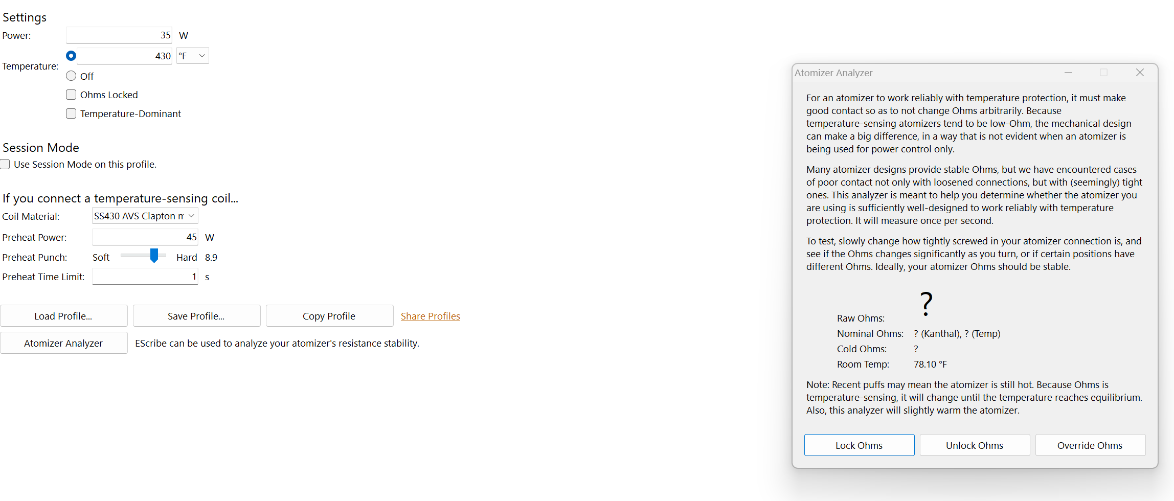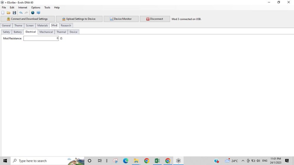 I'm going to make another attempt to show how to set mod resistance. This can not be done on all DNA boards. Not with the 75C, 100C and 200 boards. It use to be able to be done with 200's but a firmware update stopped that long ago. Start by cleaning mod's 510 and the plug with alcohol. Using EScribe set mod resistance to Zero. Start Atomizer Analizer with mod connected and screw the shorting plug into the mod's 510. Put the value from Atomizer Analizer into the Mod Resistance box and upload settings