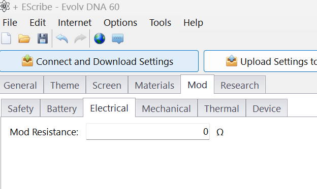 Be aware that the zero in the box is not the mod resistance, this is just what it is set to. Put your value in the box and upload to device.
