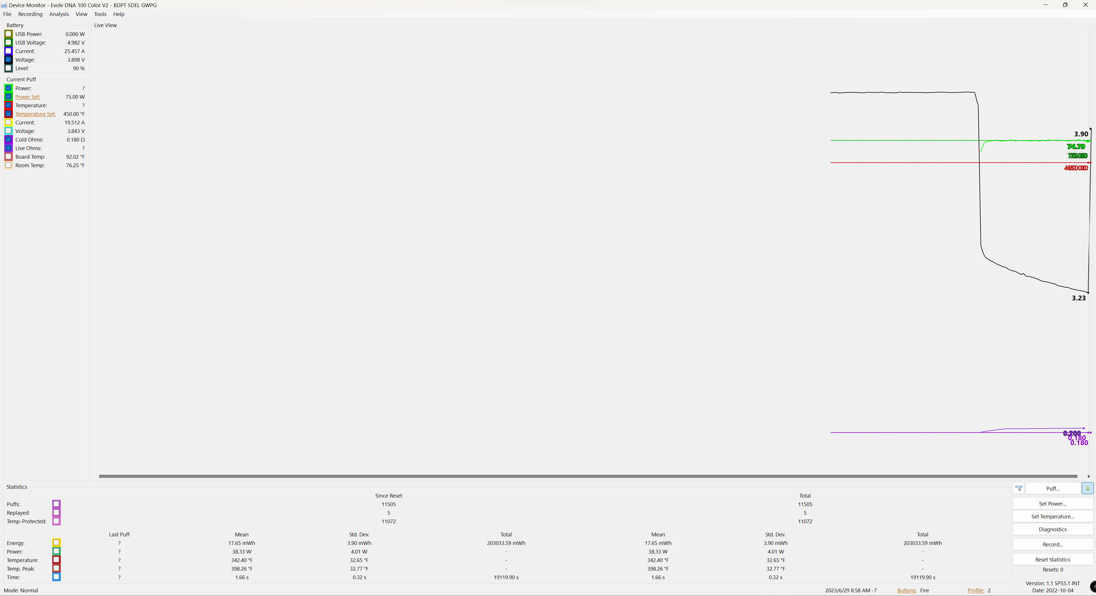 Use EScribe's Device Monitor to see voltage drop. Your Molicel P45B 21700 would be good for way more than 100 watts. There is a poor connection between the cell and board.....for sure. Here is my DNA100C with Samsung 18650 20S 30 amp cell with standing voltage of 4.0 volts firing at 75 watts. Note that the voltage dropped to 3.23 volts. It would continue to fire @ 75 watts till the voltage drop hits 2.75 volts.