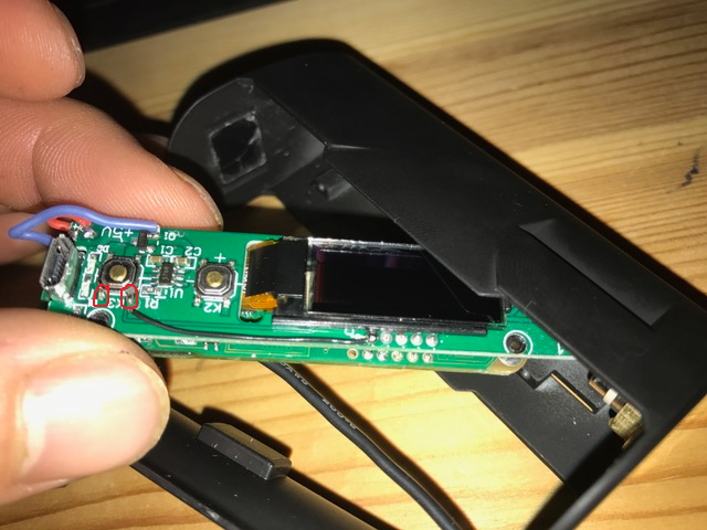 if you want to try something, solder that wire back where it was on the leg of the down button (make sure it's soldered on the SAME leg where it originally was!) and solder it to the 3rd pinout (circled in red). it was originally soldered in the wrong pinout . THIS FIX WILL ONLY WORK ASSUMING THE ACTUAL BUTTON WORKS (which i'm guessing it does since it functioned as a second up button because of the incorrect placement)! or wait and see what VD says. up to you. if i had the board in-hand i'd be able to fix it for you in 10-15 min. if the button is bad i have replacement SMD tact switches of that exact model. i mainly buy them for replacing vaporshark's faulty firing buttons.