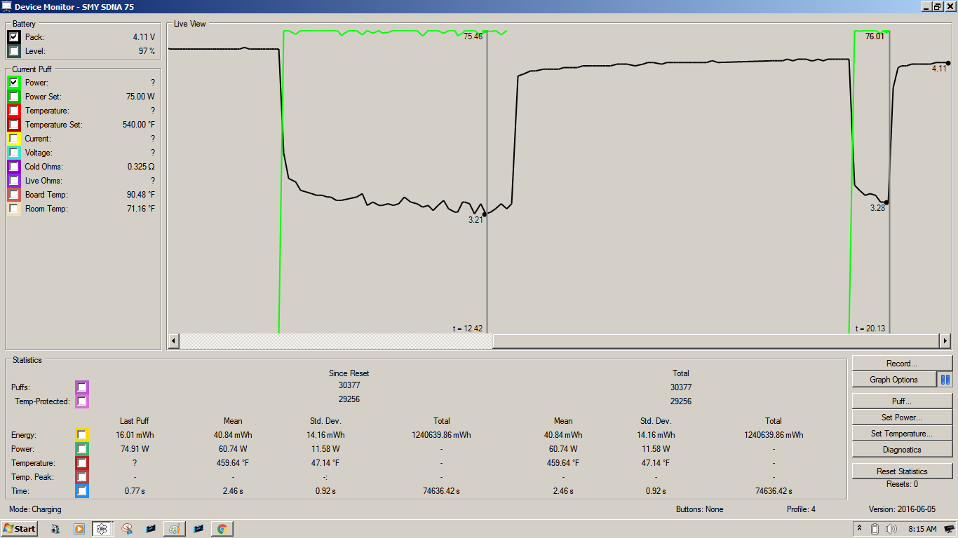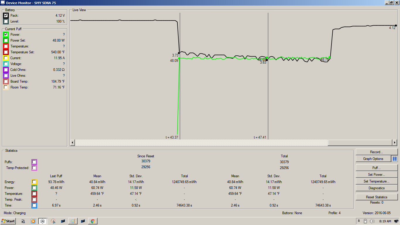 where did you buy the cells from? here's a few screenshots of one of my VTC5A's. one at 75w and the other at 48w, like yours. both with a .33 ohm load. what kind of sag do you see at 75w? what brand mod is this?