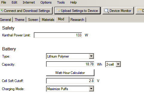 the calculated wh value is always too high. you need to run battery analyzer for an ACTUAL WH capacity or find a csv battery curve for 2 HG2's. for example. 7.4v at 3000mah = 22.2 WH's (calculated) when in reality it's closer to 17-18 WH's the dna 133/200 actually can use. cell soft cutoff is also a determining factor on how much capacity (WH) you can get out of your batteries. maximum charge voltage is also dependent on whether you choose "max puffs" or "max recharges" (4.20 and 4.10 respectively) basically, too high of a WH and the battery gauge will never show full (%100)
