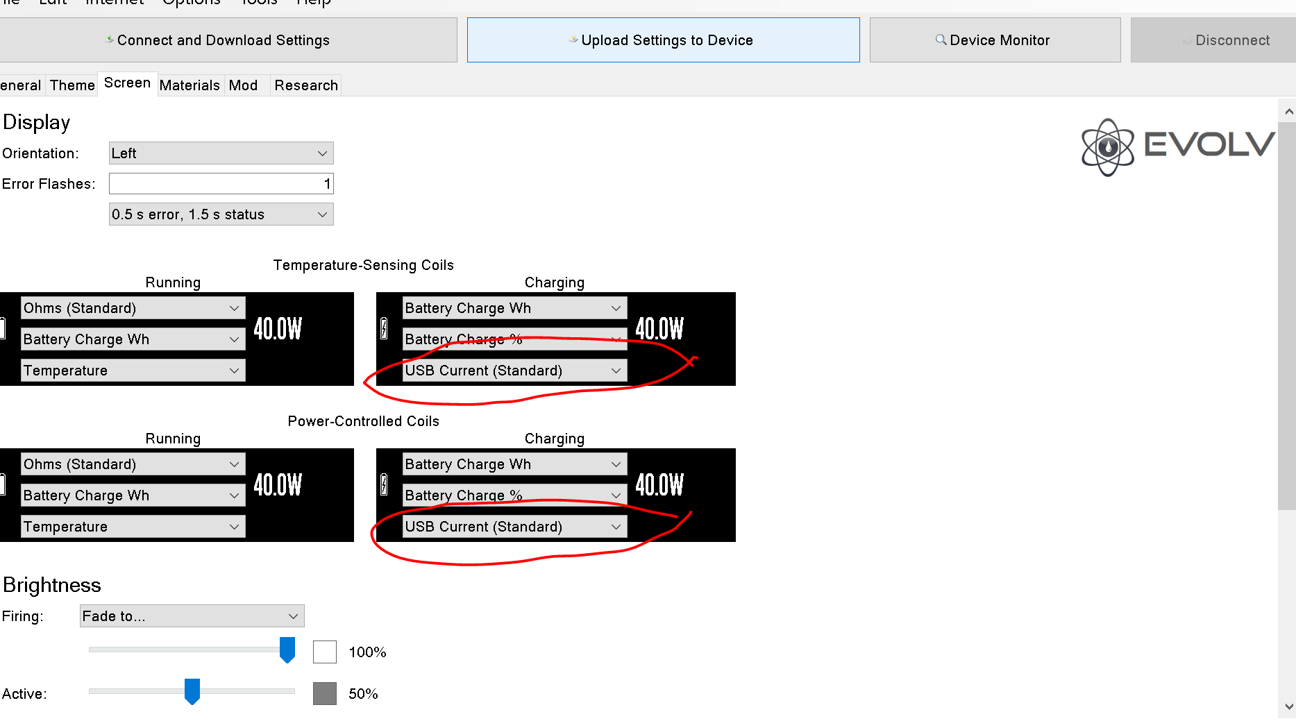 welcome rabidka! your dna 133 is not charging the batteries? is that your problem? you have everything set correctly in escribe and the wiring appears correct as well. one area that concerns me is, it says you're drawing over 3.082 amps from the USB. USB current when connected to escribe should not be over 0.5 - 1.0 amps. (depending on the type of USB port, i think) what does the dna 133 mod screen say the USB current is? if you select "USB current" under "screen" tab in escribe and "upload to device". what does mod screen say, how much USB current? i hope you can understand what i'm trying to say.