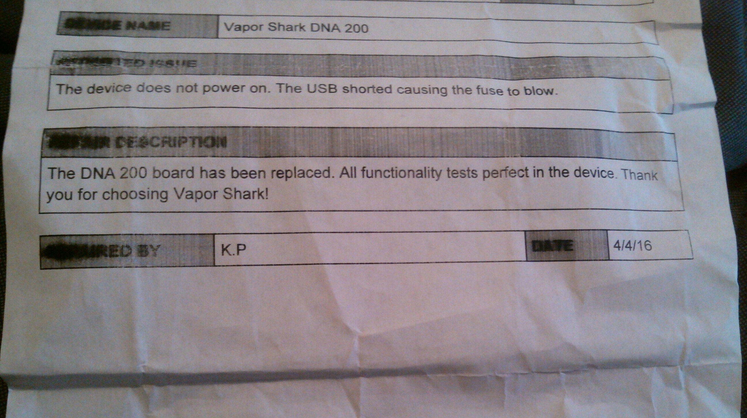 EDIT........i received my repaired VS dna 200 in the mail today. here's the repair ticket VS included with my repaired unit. however, i would like hear some intelligent thoughts/answers as to what kind of USB fault would draw over 25 amps blowing the fuse. the outer part of the USB socket is grounded, as is the aluminum VS body. so what would cause a hard short? shoddy soldering on VS part? maybe the balance tap or main wires were soldered with excess solder or a stray wire finding it's way to the USB area? even with a blown fuse the device should connect to escribe. i would understand if the USB is severely shorted, then escribe would not be able to make a connection. like i said, if anybody has some in depth, intelligent thoughts, i'd like to hear them.