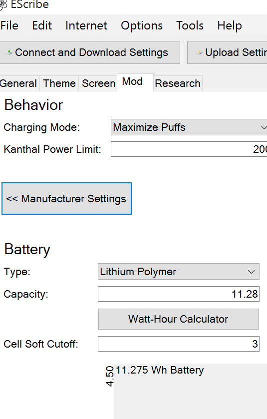 22. here's the batt orientation cell 1 in my relo always acts a tiny bit funny. sometimes while firing it'll drop more or less than the other two cells. i've come to accept this as normal. they equal out after a few seconds of releasing the fire button. no cause for concern unless one battery has severe voltage drop compared to the others when firing. make sure in escribe under manufactures settings, you have have maximum puffs highlighted and not maximum recharges. to fully charge your batts. 27.75 is the calculated value for your 25r's. you'll never extract that amount from your batts. it'll be closer to 25-26, somewhere around there. i strongly suggest learning how to run battery analyzer to get the most out of your device read through these threads: /topic/67176-topic/ /topic/65611-topic/