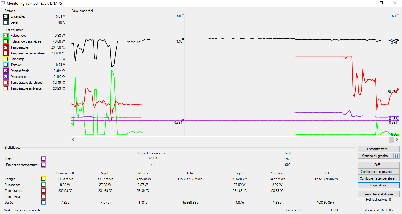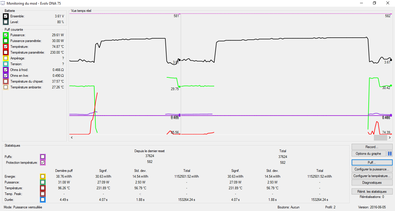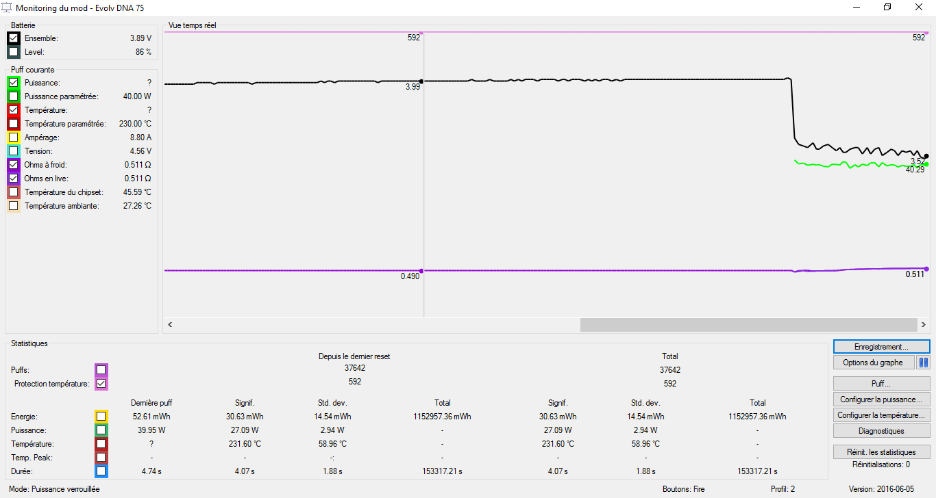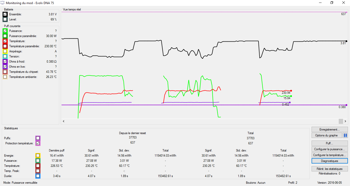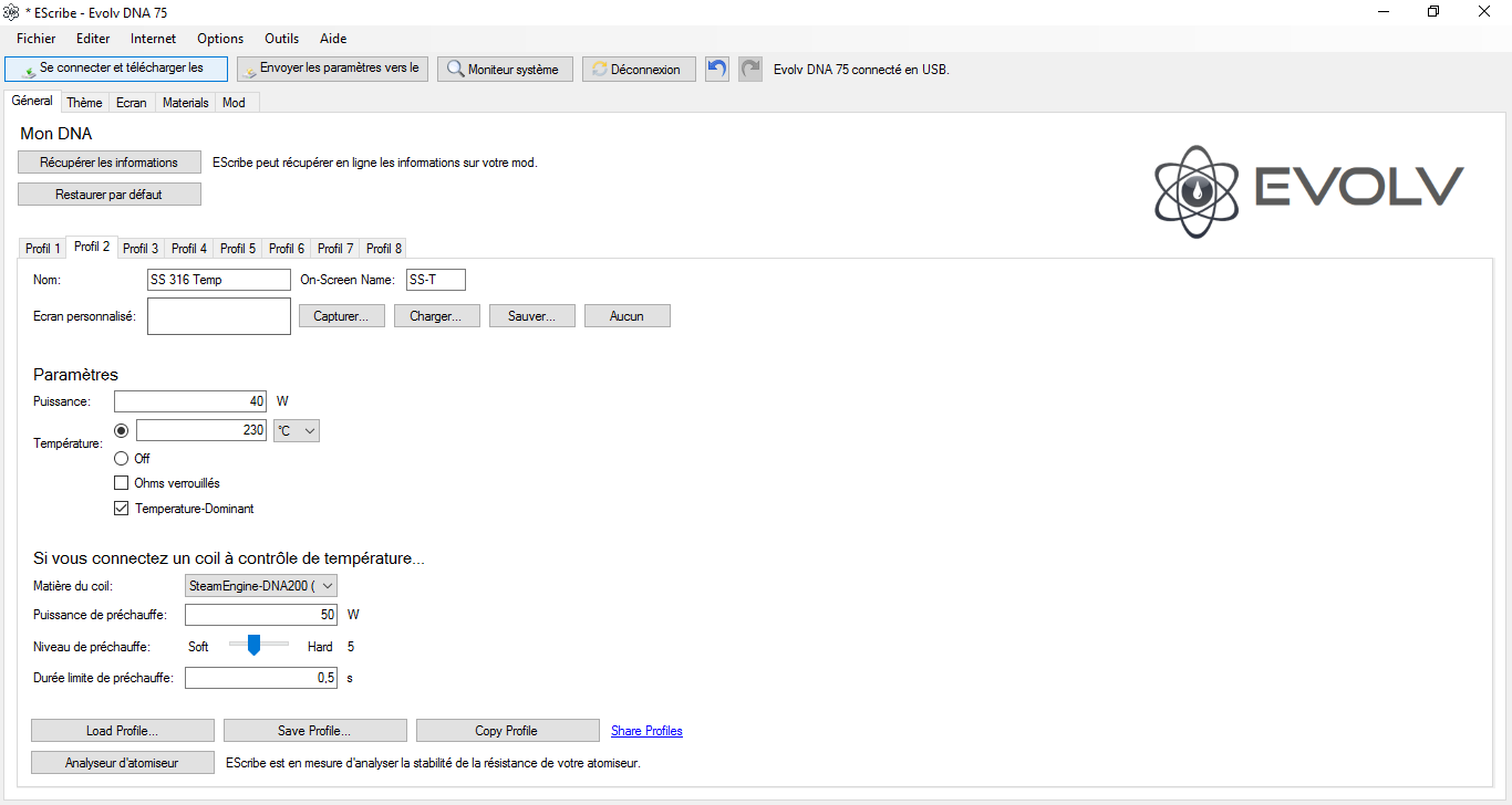 Hello, I got some issues with my LAVABOX 75. My temperature never hit 230°C. It is stuck at ~100°C. It seems that my resistance is never stable too. My atomizer is a Mage with a dual coil SS316L. Sometime I got a message saying "Temperature protected" but the coil is not even heating so I got no smoke at all. Can someone help me please? Here's some screenshot of the profile and materials I use. I tried the 2 SS316L profils and I got the issue with both of them. Thanks in advance! (sorry for my English, this is not my native language)