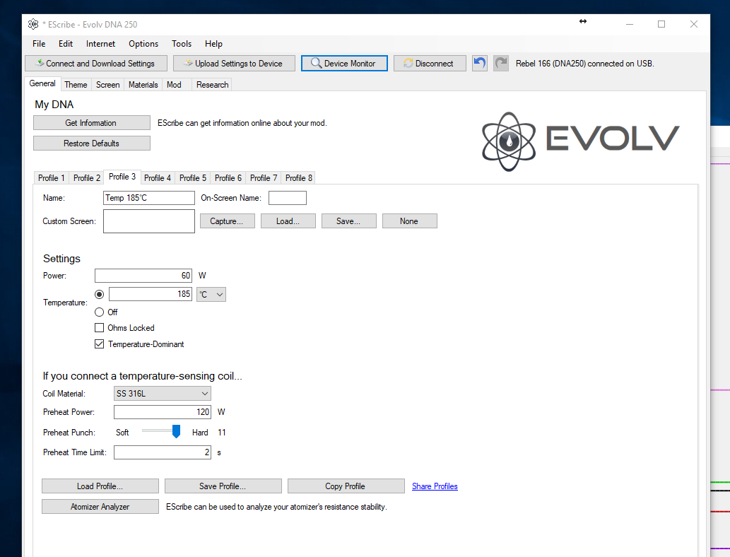Hi guys, I'm fairly new to vaping (about 3 months) and thought it's about time I tried out Temp Control, lets face it, what's the point in using a DNA device in WATT mode only. I've got a bunch of SS 316L wire coming in the next few days. Wire is as follows: All SS 316L from Crazy Wire Fused Clapton - 24 AWG X 2 & 32 AWG Wrap Fused Clapton - 26 AWG x 2 & 32 AWG Wrap Juggernaut Wire - 26 AWG + 32 AWG x 2 + 0.1mm x 0.9mm Ribbon Wrap I have noticed that my Therion 166 & Rebel Vape DNA 167 do not have a pre-installed profile for SS316L. Do I simply used the SS 316 material settings? If I need specific 316L settings/config can som1 point me to the most reliable files & settings I need to upload to my device. Thank you in advance for all your help