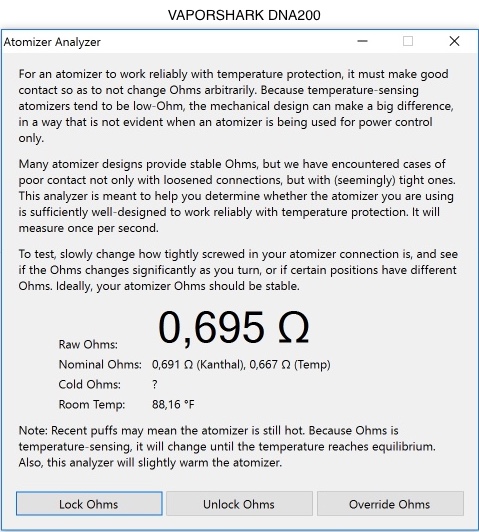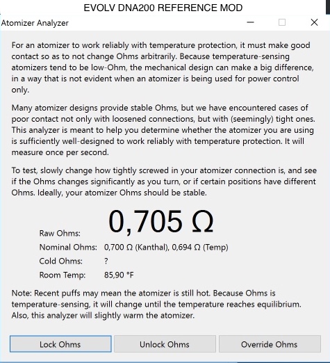 Well, I'm pretty much confirming all of the above: 1) SP23 improved "precision" of cold ohm sampling. Note I used "precision" as what has improved is the stability (or repeatability) of the measure. If I take several samplings, I get much more consistent and similar values (barring the physiological slight increase due to the measurement slightly warming the coil) than before (where it was more jumping here and there across different back-to-back measurements) 2) SP23 doesn't seem to have improved "accuracy" of cold ohm sampling: I took the same atomizer (a TC-friendly one, with no springs, direct center-pin-to-post positive path) with a SS316L coil on the therion 75C, the vaporshark 200 and an EvolvReferenceMod 200 and you can see the output from AA here below. Keep in mind real room temperature is ~86F, so the ERM is the most accurate as far as room temperature goes. The headline is: the 75C still reads lower, _my_ therion seems to be ~ 0.024 below (instead of 0.04), but that's still enough to swing the temperature by ~60F with SS316L. Unfortunately at the moment I don't have my other 75C which is out for repair, so I couldn't put that to test as well. Oh, as a final note, manually correctly the cold ohm value on the 75C, brings the temperature value I have to use back to its normal 390/400F range, instead of the "tuned-by-taste" 475F value I need after a "real" cold ohm sampling. Here we go: EDIT: I'm sorry but I can't seem to find a way to avoid the attached screenshot being duplicated... I see each of them only once in preview, but then when I save the message they get duplicated...