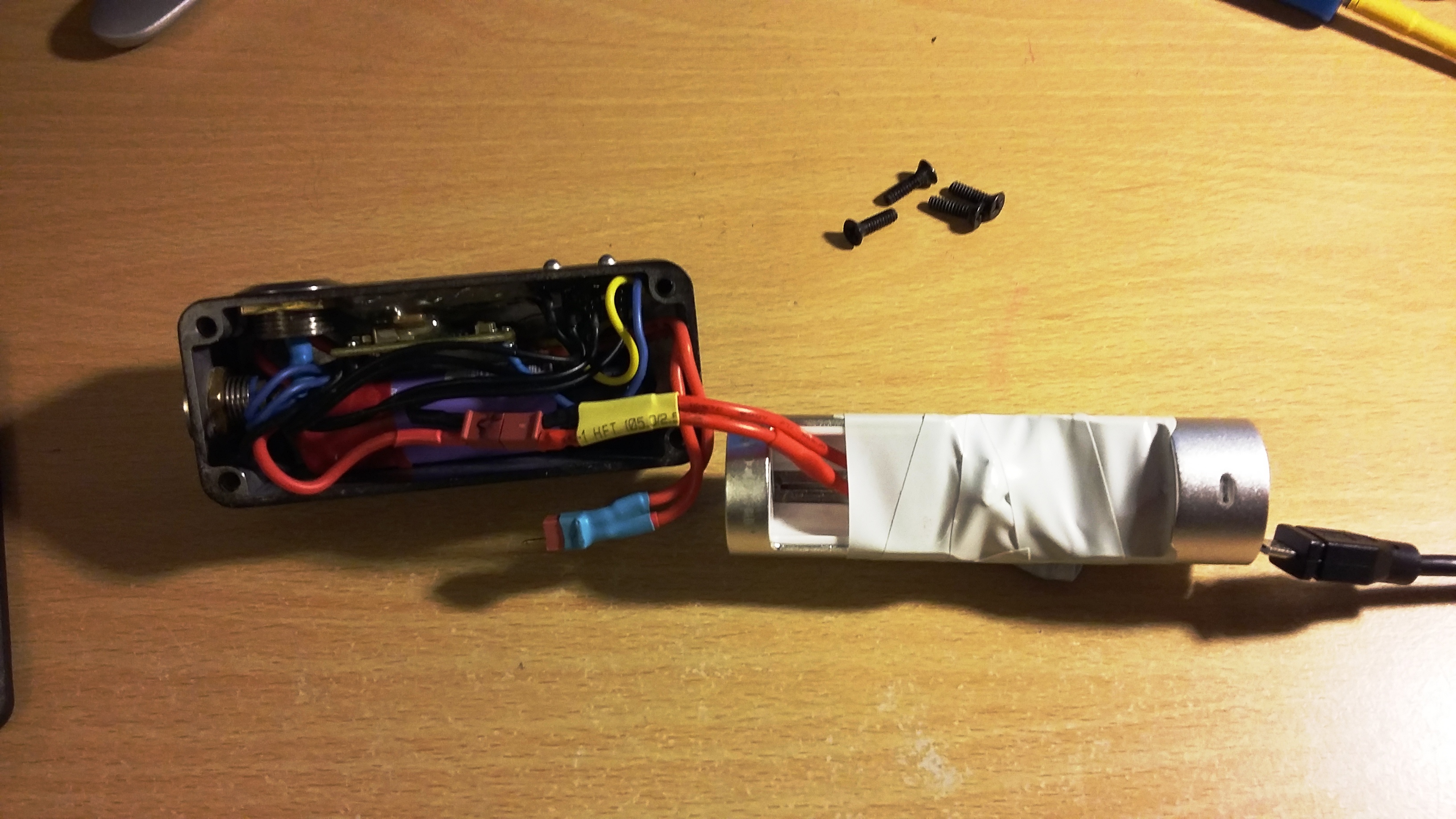 arh OK I see what your on about, I hooked something up on a similar line for a DNA 40 with a broken charger .50amp on board charger, broke down, but probably got beer in it,, a temp fix while I order a new board to fit but this sled puts out 1amp. I don't think there would be room for the new evolve 1 amp charger, I think the 1590 a boxes are a cracking little home build but a pain in the neck as far as maintenance goes, I've already had to convert failed push type fireing buttons on four of these to the newer mi tech tactile, but as it goes, one gets one they all want one..lol..