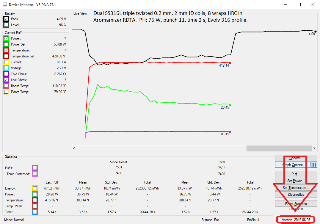 Markyt123 do you have the same battery as one AMDtrucking used? The csv only acts as a look up for the board to estimate the battery level and will only be valid for that make and model of battery, it does not affect performance. By that csv the voltage difference between 31.5% and 95.2% is only 0.07 V so it's going to be extremely difficult for any mod designed to use a 3.7 V Li battery to estimate a percentage with any accuracy in that range. It is worth checking all your connections are clean and tight, and looking at the voltage sag in EScribe to better evaluate if your battery can work, but If it can't you can use a more standard battery so all is not lost. (The DNA 75 was not designed to use LiFePo4 batteries, they are not supported and you are in the at your own risk experimental zone, not saying it's impossible, just not supported.)