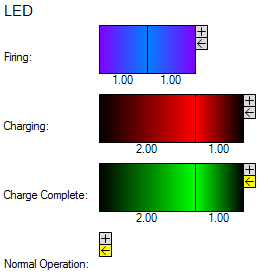 You set a begin and end colour for a time period and these can be chained together. The default charge light starts black and changes to red over 2 seconds, then red changing to black in 1 second. So the glow grows twice as fast as it fades making a more interesting affect.