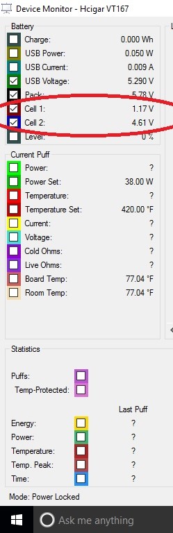 Cell 1 : 1.17V Cell 2 : 4.61V Switch battery position or using other full charged battery type/brand (vtc4/vtc5/samsung 25r/lg hg2) is also the same results.